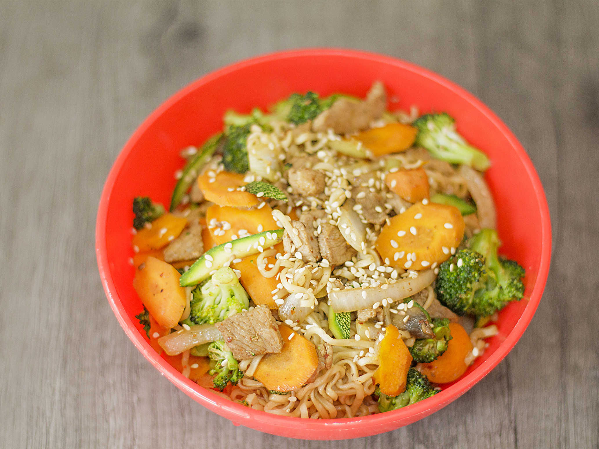 Ramen, zanahoria, calabaza, cebolla, champiñón y brócoli. Carne: res