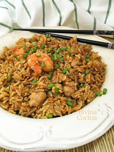 Brócoli,zanahoria, calabaza, cebolla, champiñón y germen de soya acompañado con arroz frito