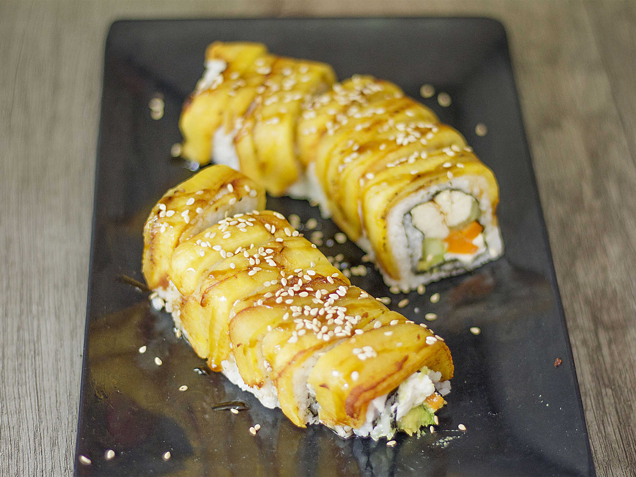Cubierto de plátano por fuera incluye, philadelphia, zanahoria, pepino y aguacate por dentro. Elige una Carne de tu preferencia.