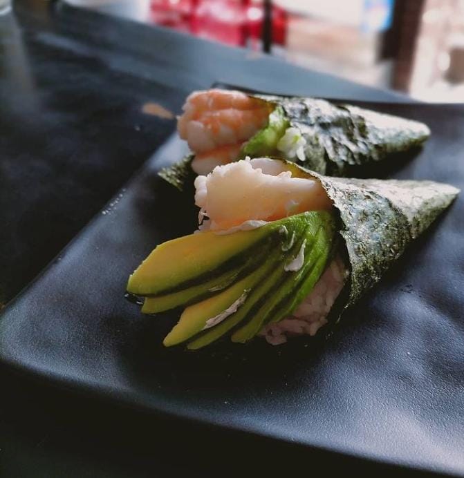 Cono California, con aguacate, Philadelphia, pepino y camarón.