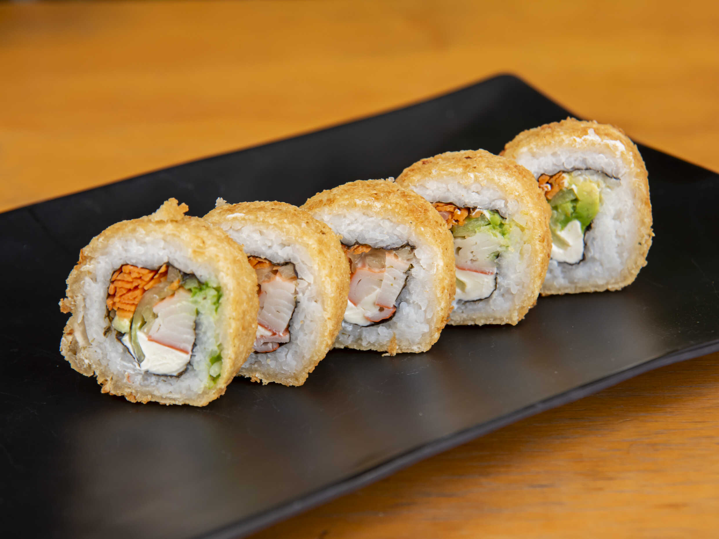 Rollo frito relleno de la proteina de tu eleccion, pepino, zanahoria y philadelphia
