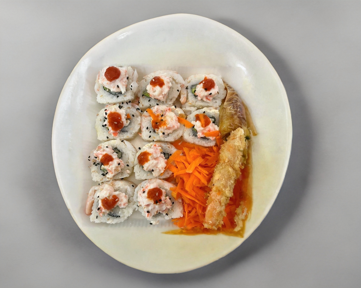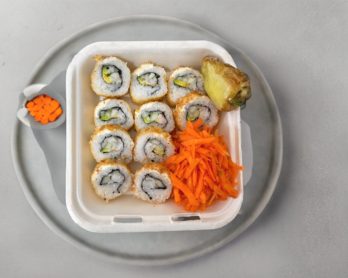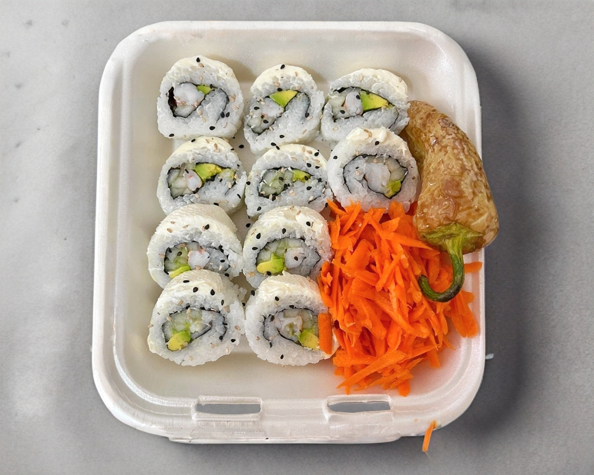 Cubierto de queso Filadelphia, en el interior; Camarón, Pepino y Aguacate. Acompañado de zanahoria rayada y chile guero
