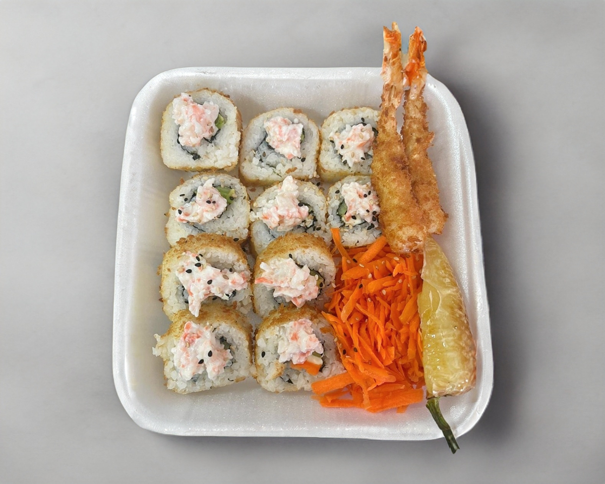 Empanizado, en el interior; Camarón, Pepino, Aguacate y Queso Filadelphia, encima un topping de ensalada Tampico, salsa de anguila, ajonjoli y dos camarones empanizados, zanahoria rayada y chile guero