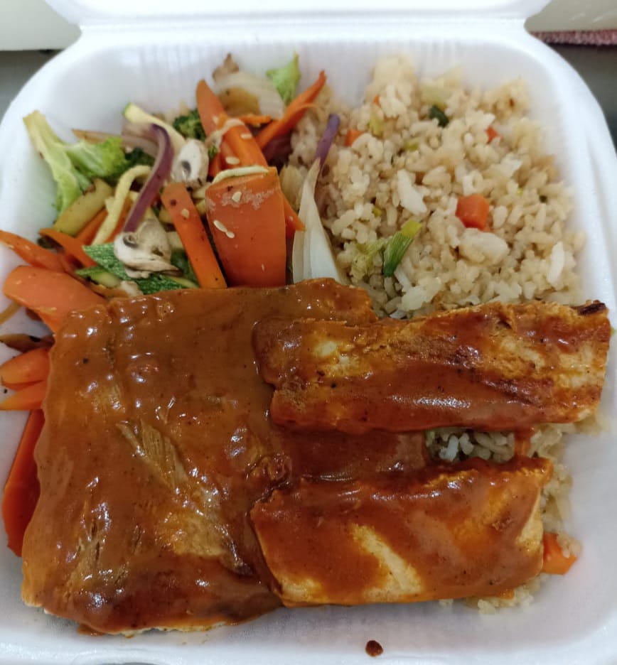 Pescado bañado con salsa especial a la diabla, acompañados de verdura de Teppanyaki y arroz frito
