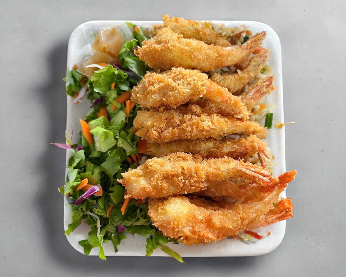 Camarones empanizados, acompañados de verdura de Teppanyaki y arroz frito