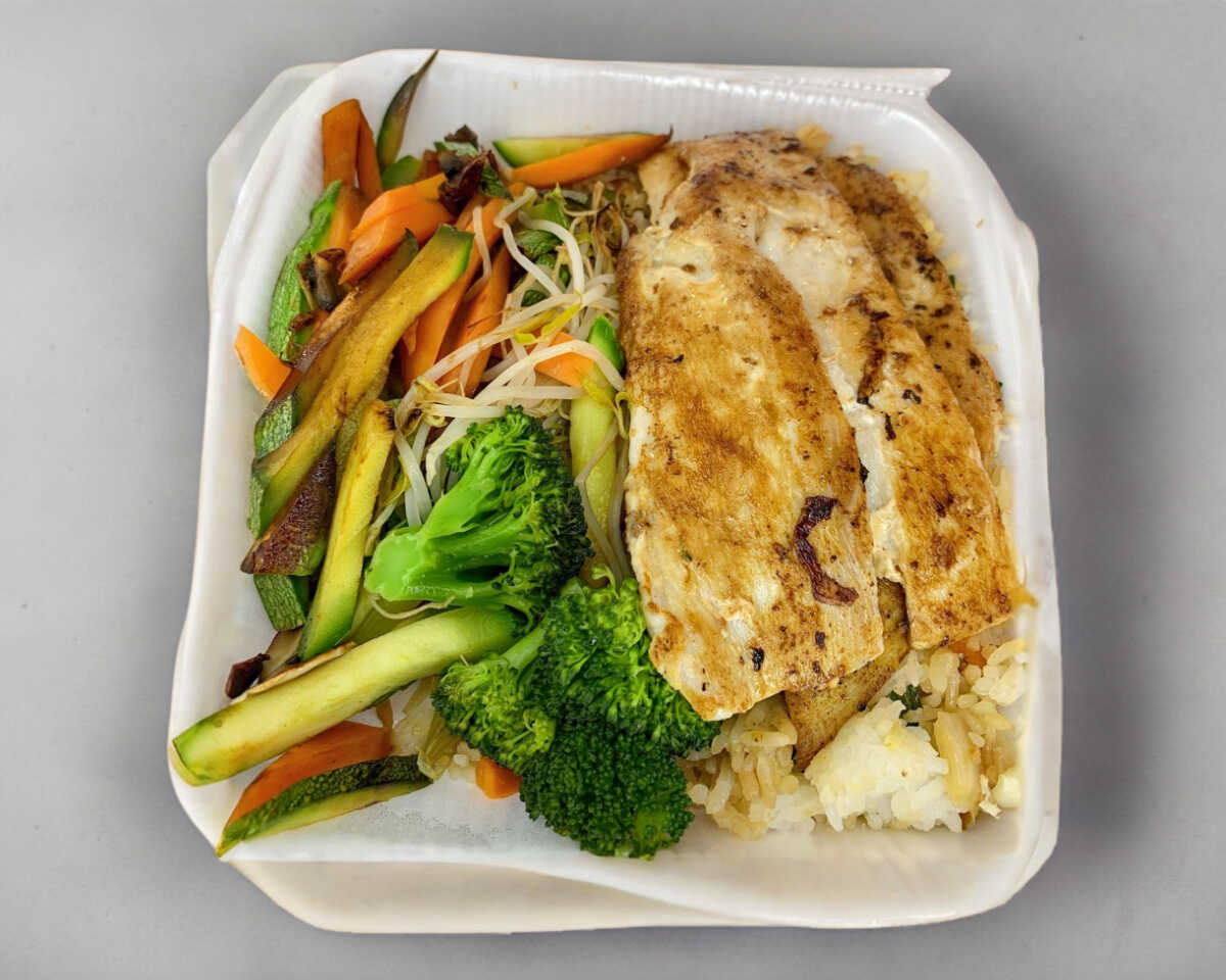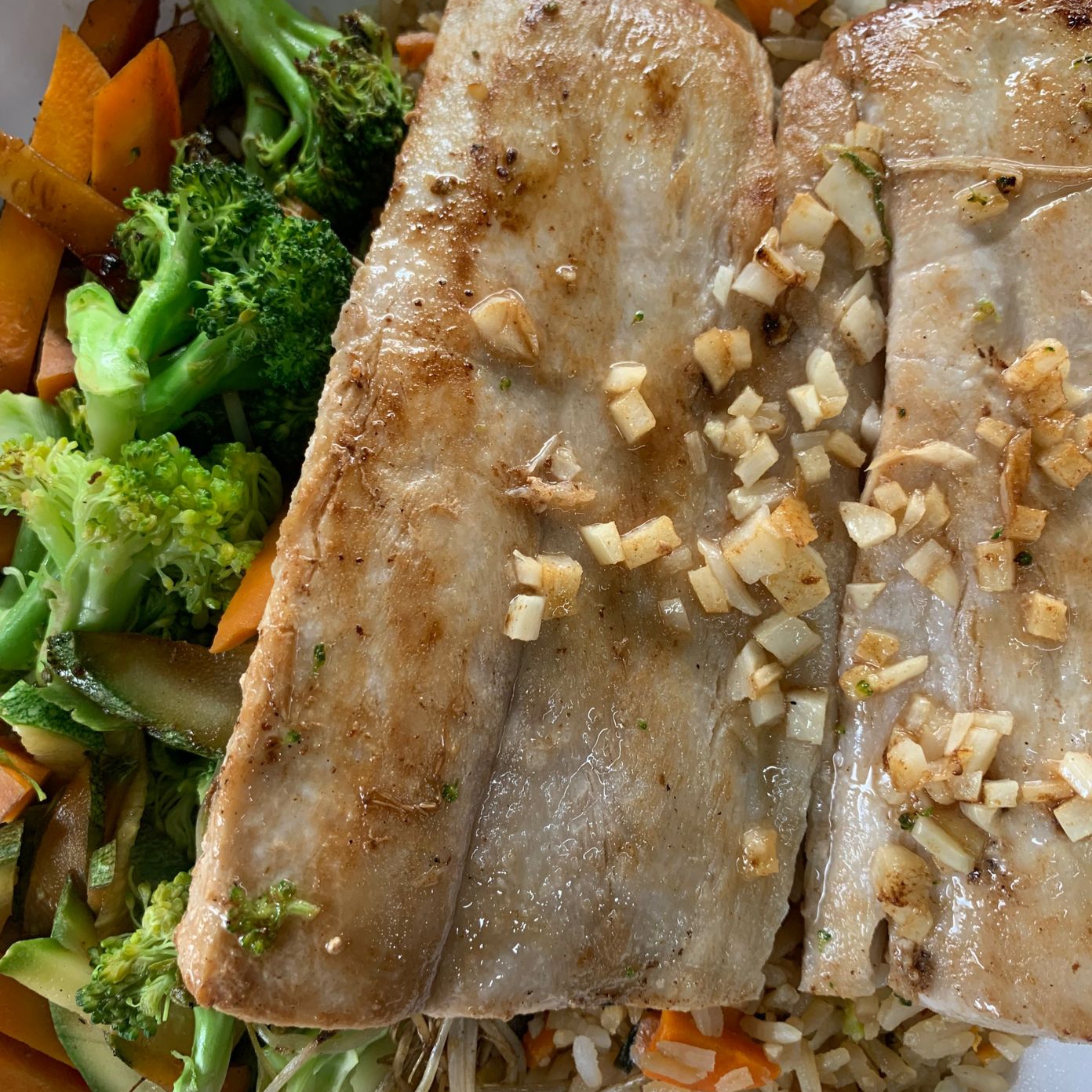 Pescado a la plancha sasonado con ajo y pimienta, acompañados de verdura de Teppanyaki y arroz frito