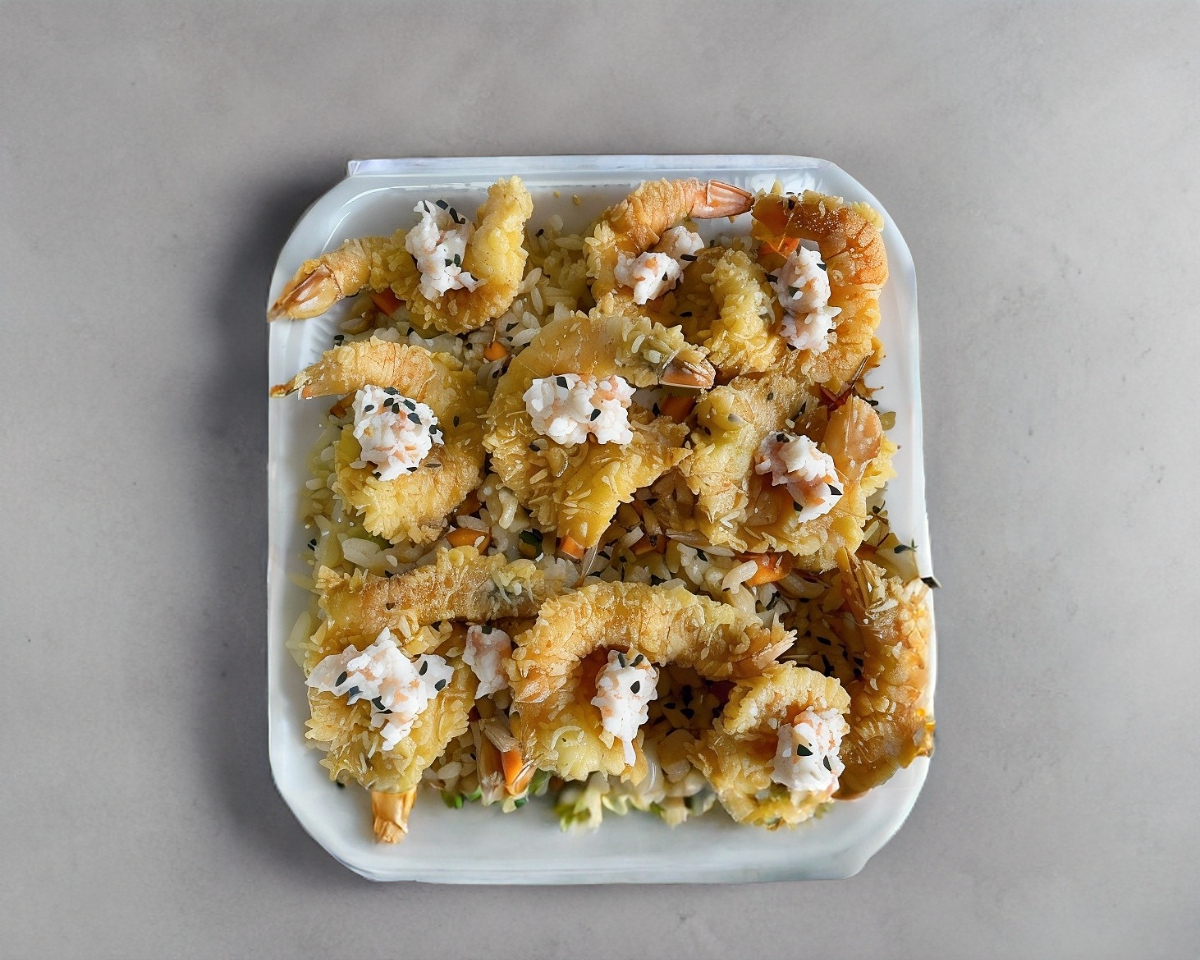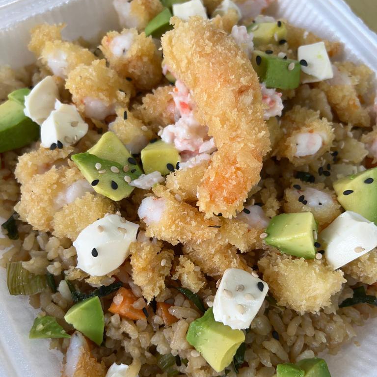 Cama de arroz frito con una orden de Camarón empanizada, aguacate, queso filadelphia, aderezo tampico y ajonjoli.