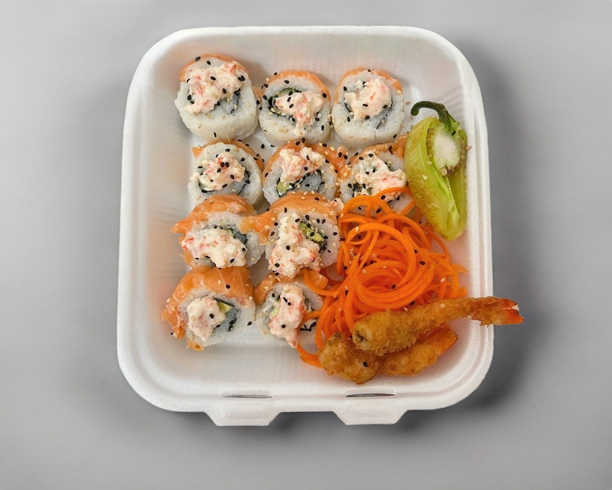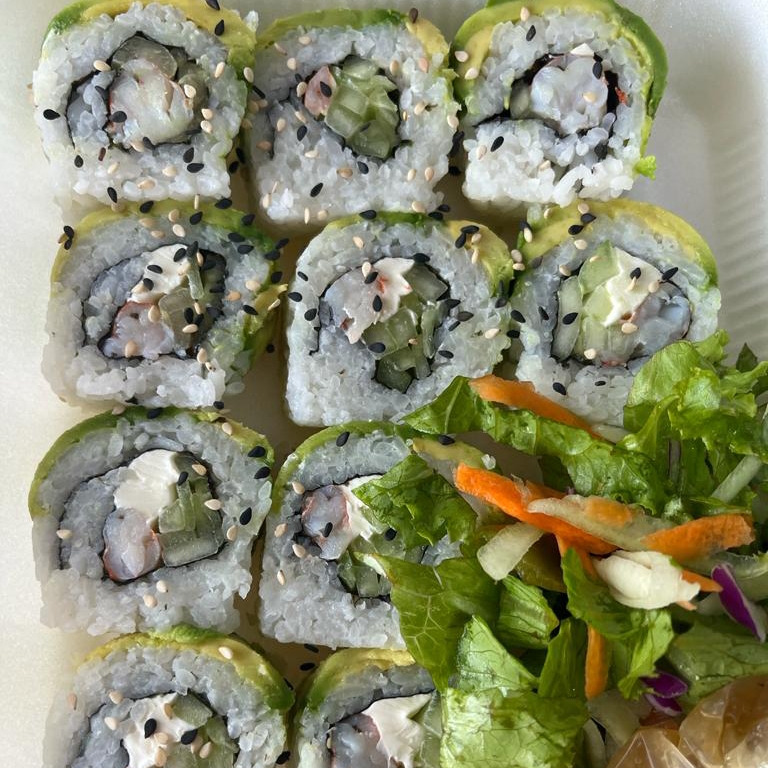 Tradicional con alga por fuera, en el interior; Camarón, Pepino, Aguacate y Queso Filadelphia. Acompañado de ensalada fresca.
