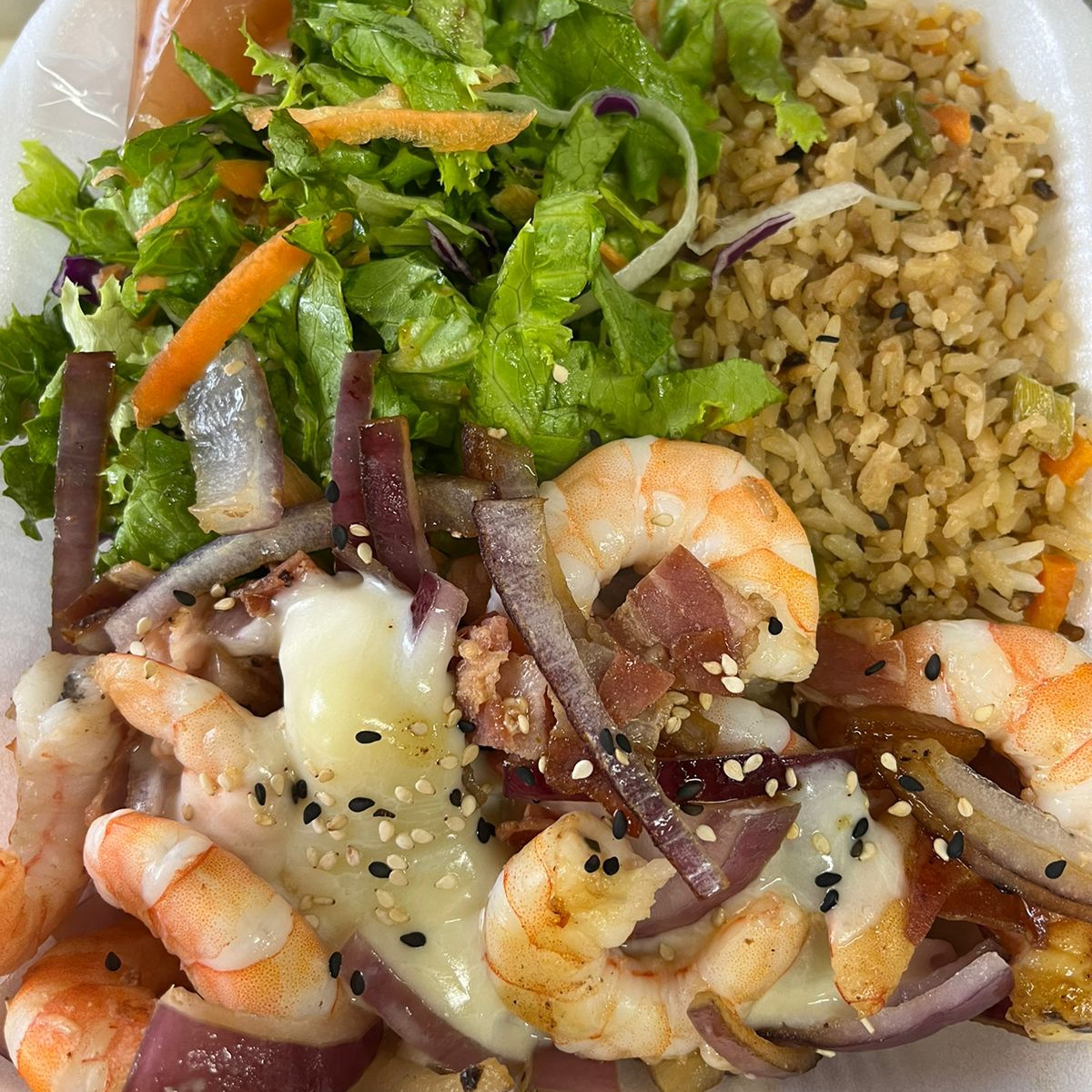 Camarones con tocino, cebolla, champiñon y queso gratinado, acompañado de ensalada fresca y arroz frito