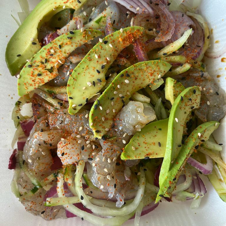 Camarones frescos curtidos en limón, con pepino fresco en forma de espiral, cebolla morada, sal, pimienta, salsa de soya, bañados con picante (chile asado yahualica)