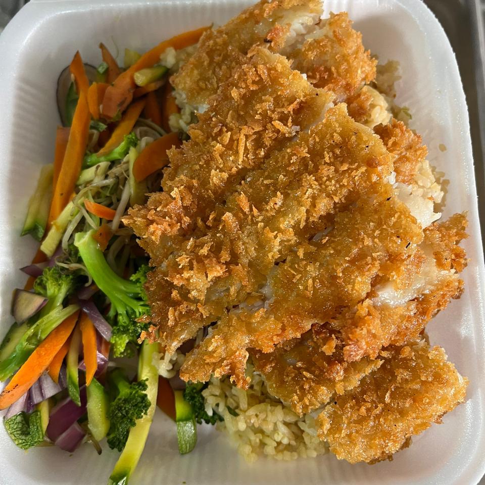 Pescado empanizado, acompañados de verdura de Teppanyaki y arroz frito