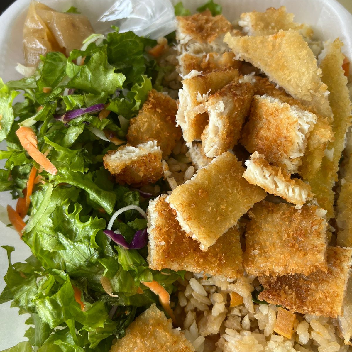 Pollo empanizado, acompañado de ensalada fresca y arroz frito