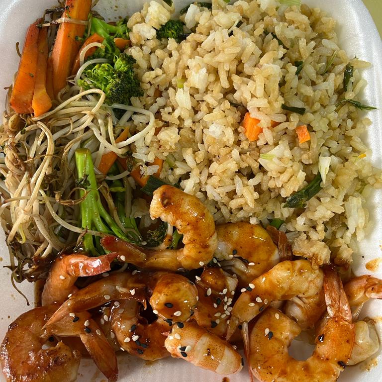 Camarones bañados con salsa especial zarandeada, acompañados de verdura de Teppanyaki y arroz frito