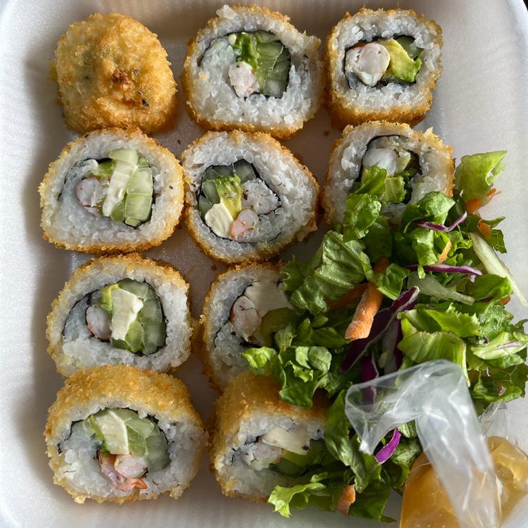 Sushi capeado, en el interior, camarón, pepino, aguacate, y queso filadelphia, bañado con aderezo Tampico, salsa de anguila y ajonjolí. Acompañado con ensalada fresca. (10 BOCADILLOS)