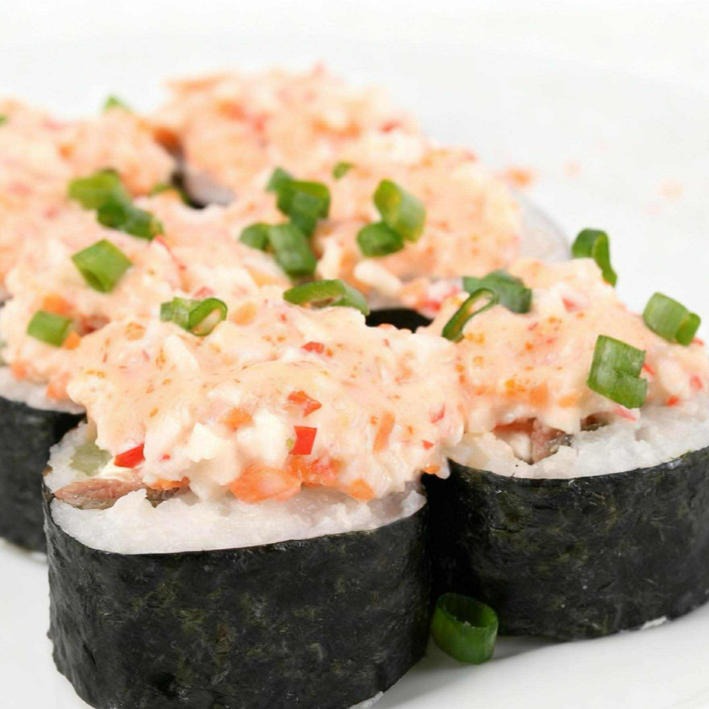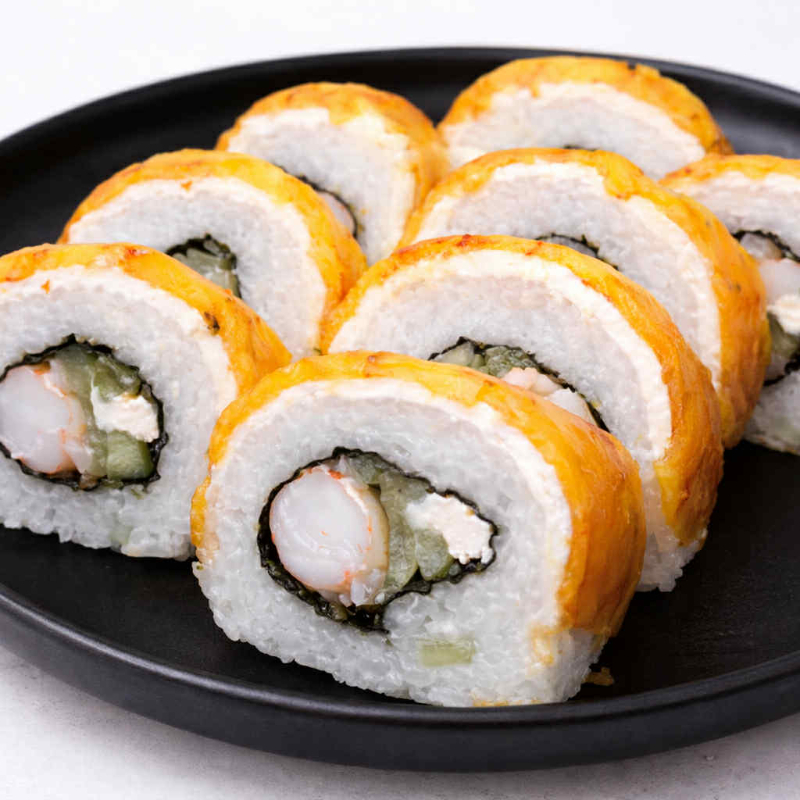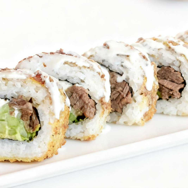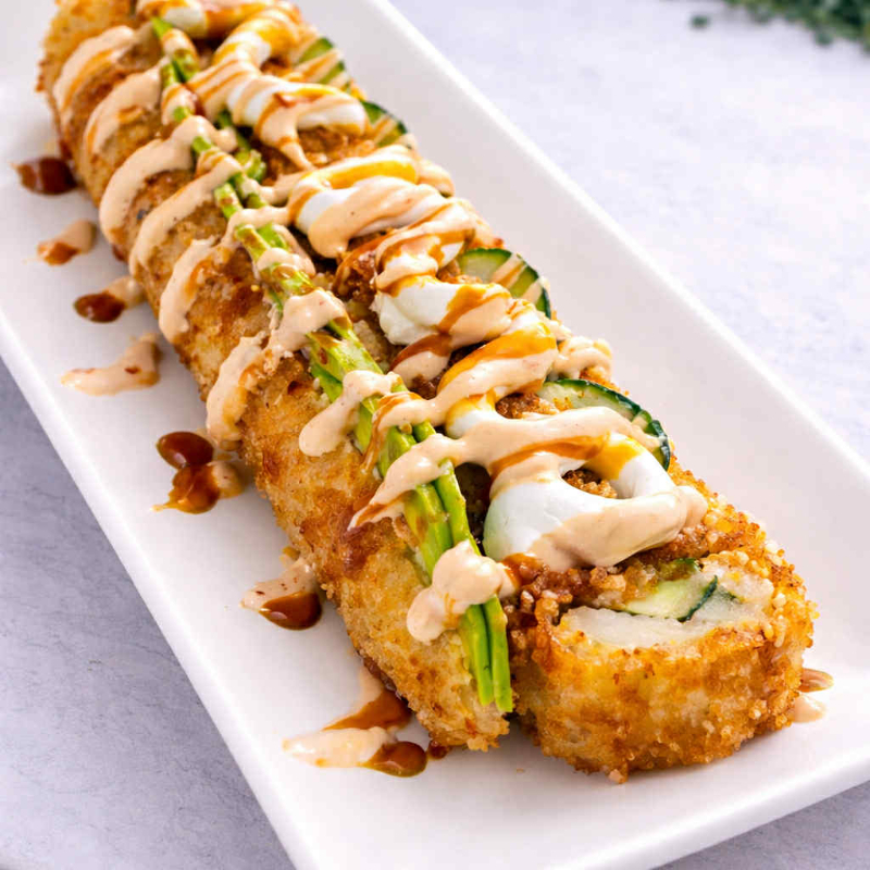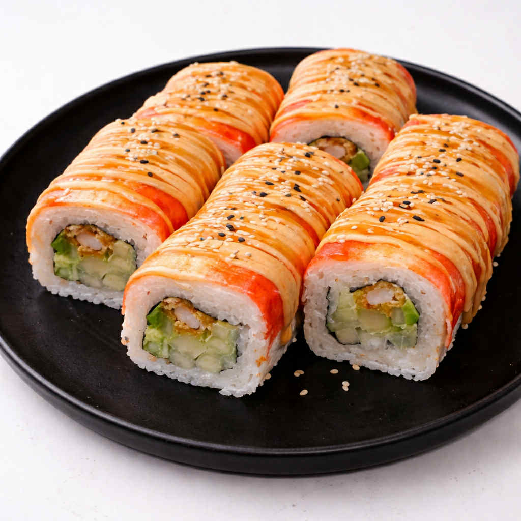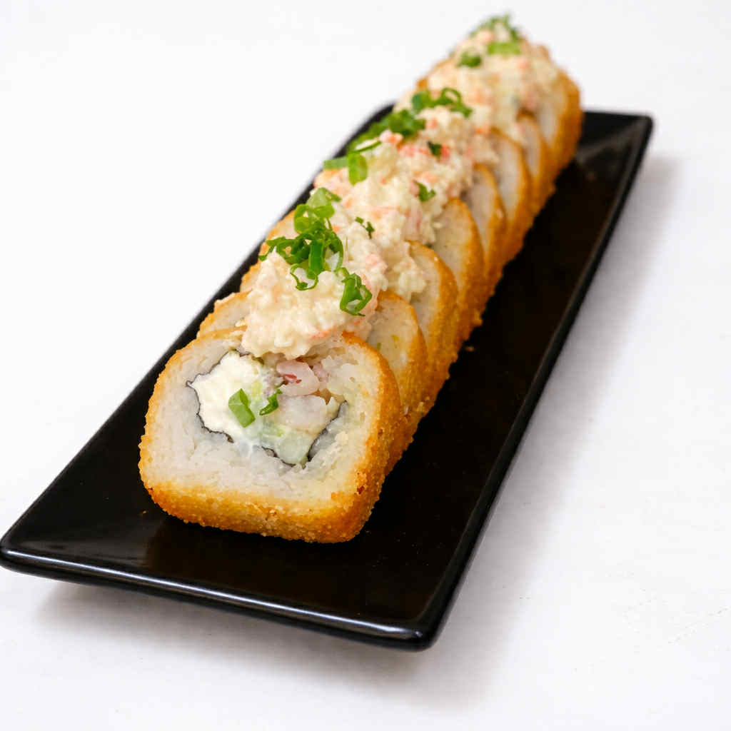 rollo de Philadelphia y surimi frito por fuera, coronado con aderezo spicy y salsa de anguila