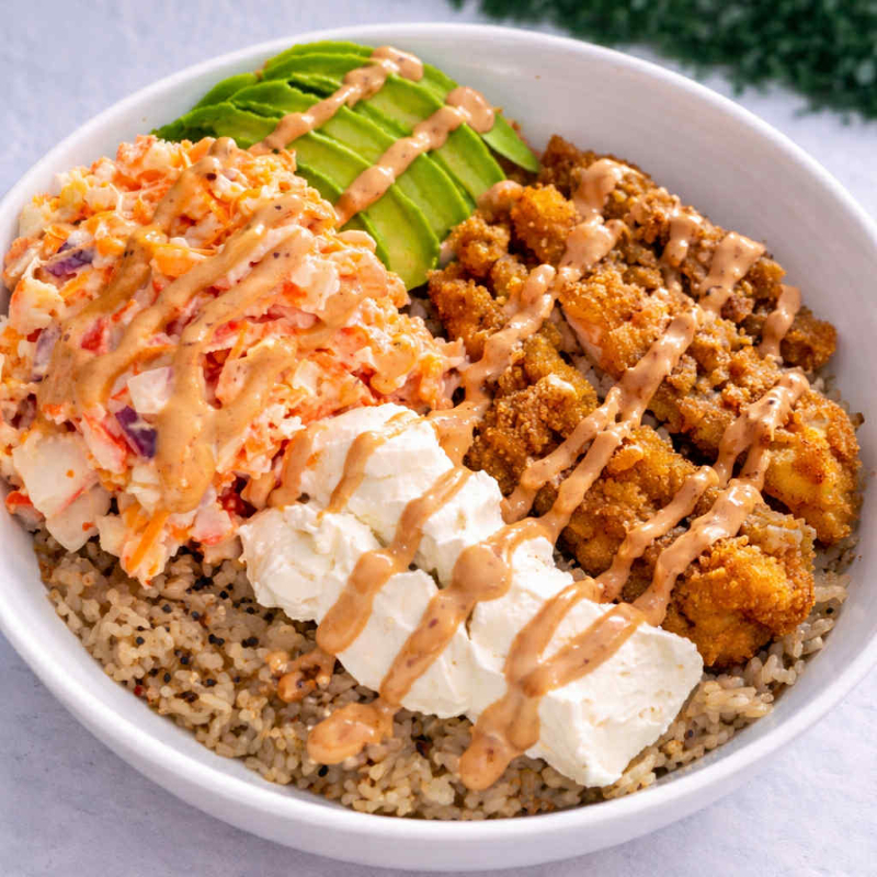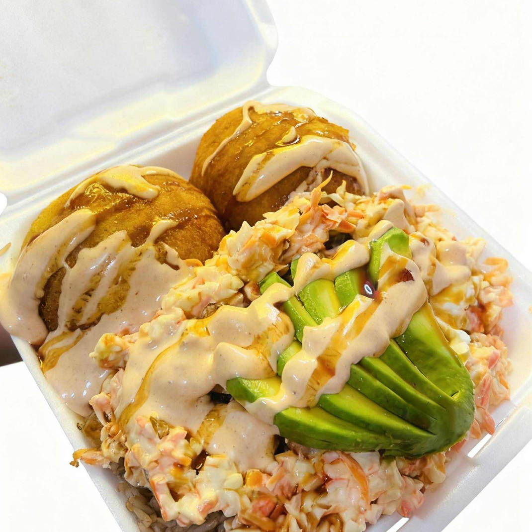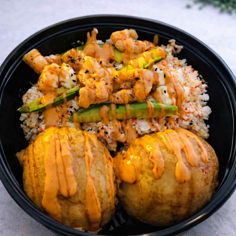 bola de arroz empanizada partida en mitad, con ensalada Tampico, Philadelphia, aguacate, aderezo chipotle y salsa de anguila proteina a elección (Incluye arroz frito)