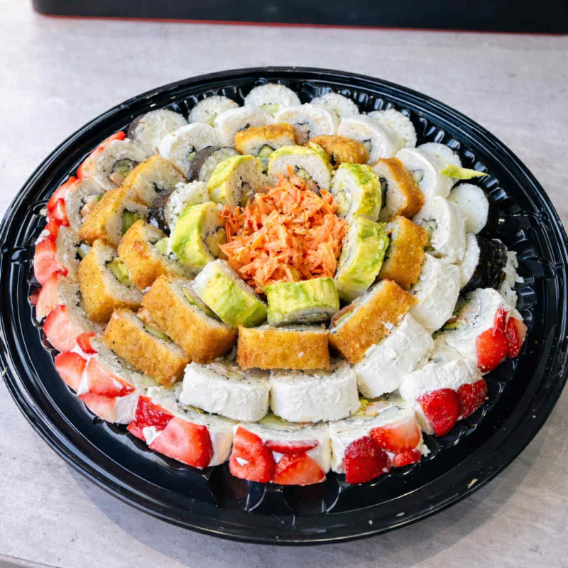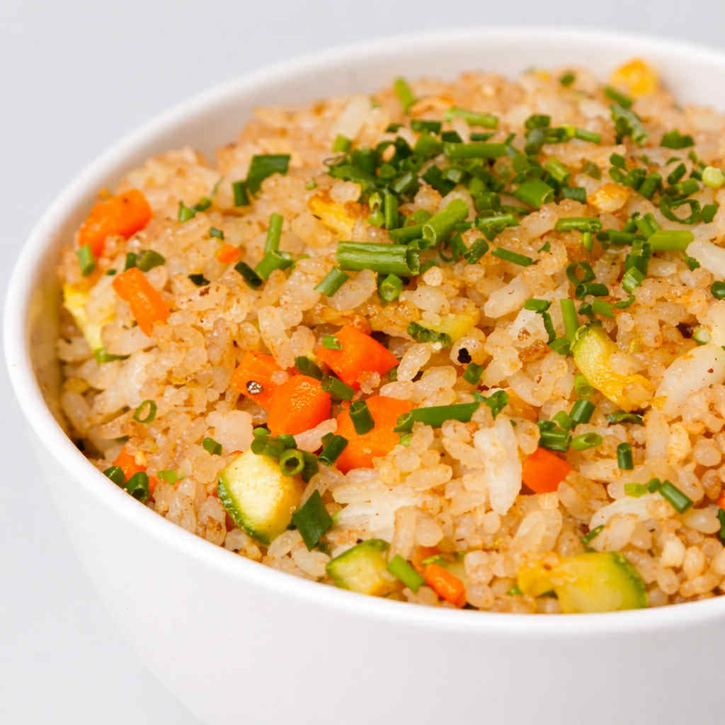 Arroz frito con queso cheddar, champiñones, ensalada Tampico, aguacate, Philadelphia, ajonjoli negro