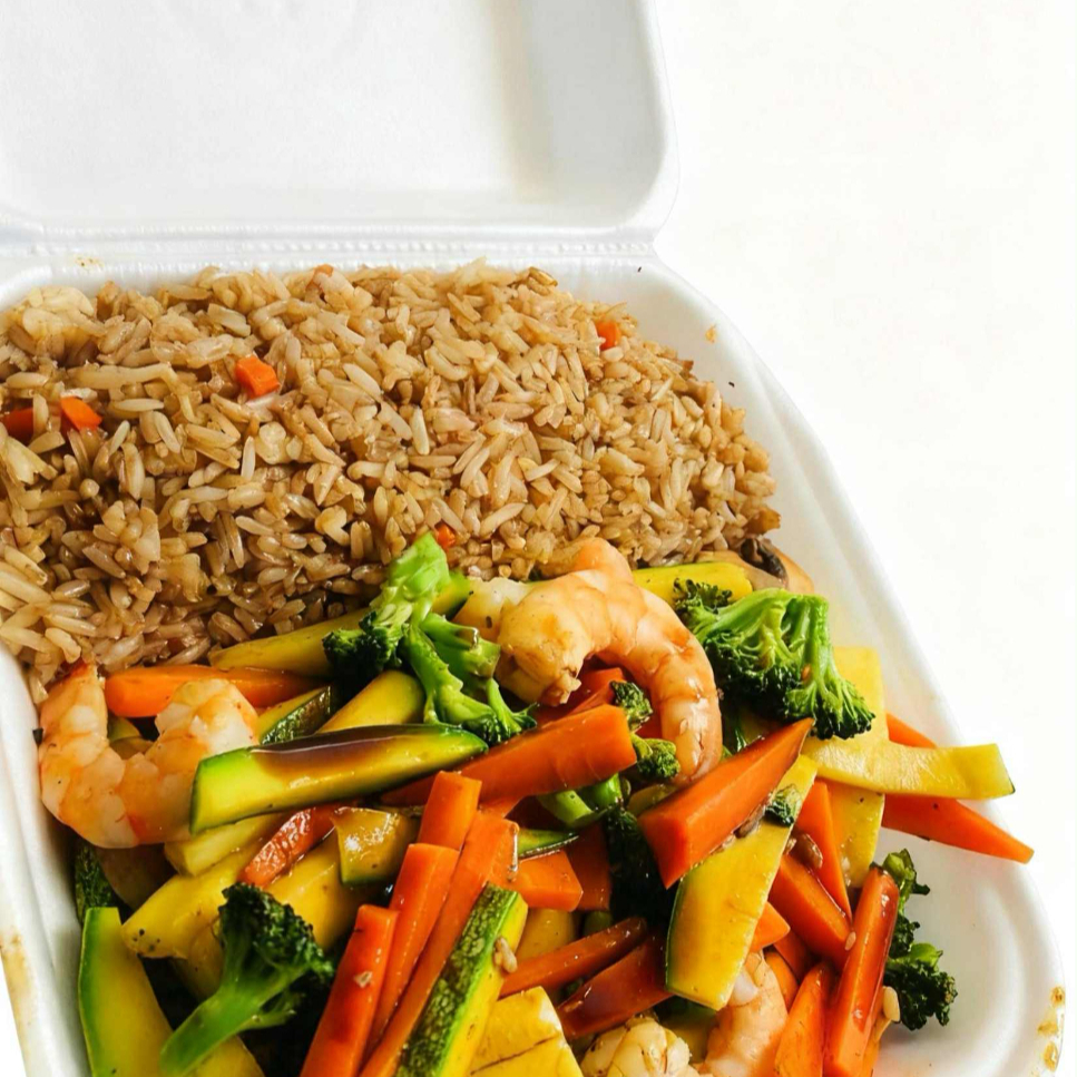 verduras al vapor con una porcion de arroz blanco, proteína a elección