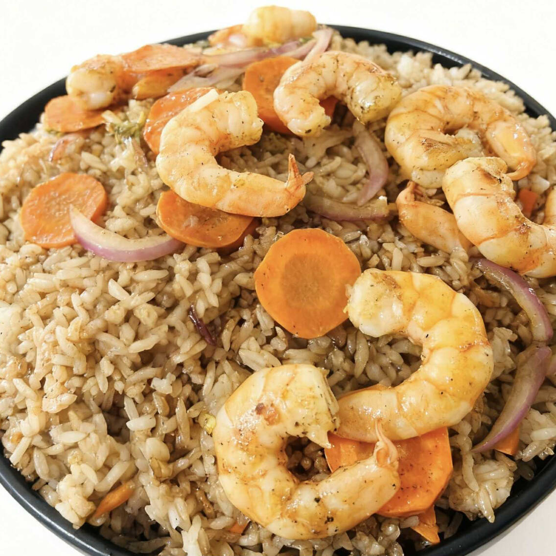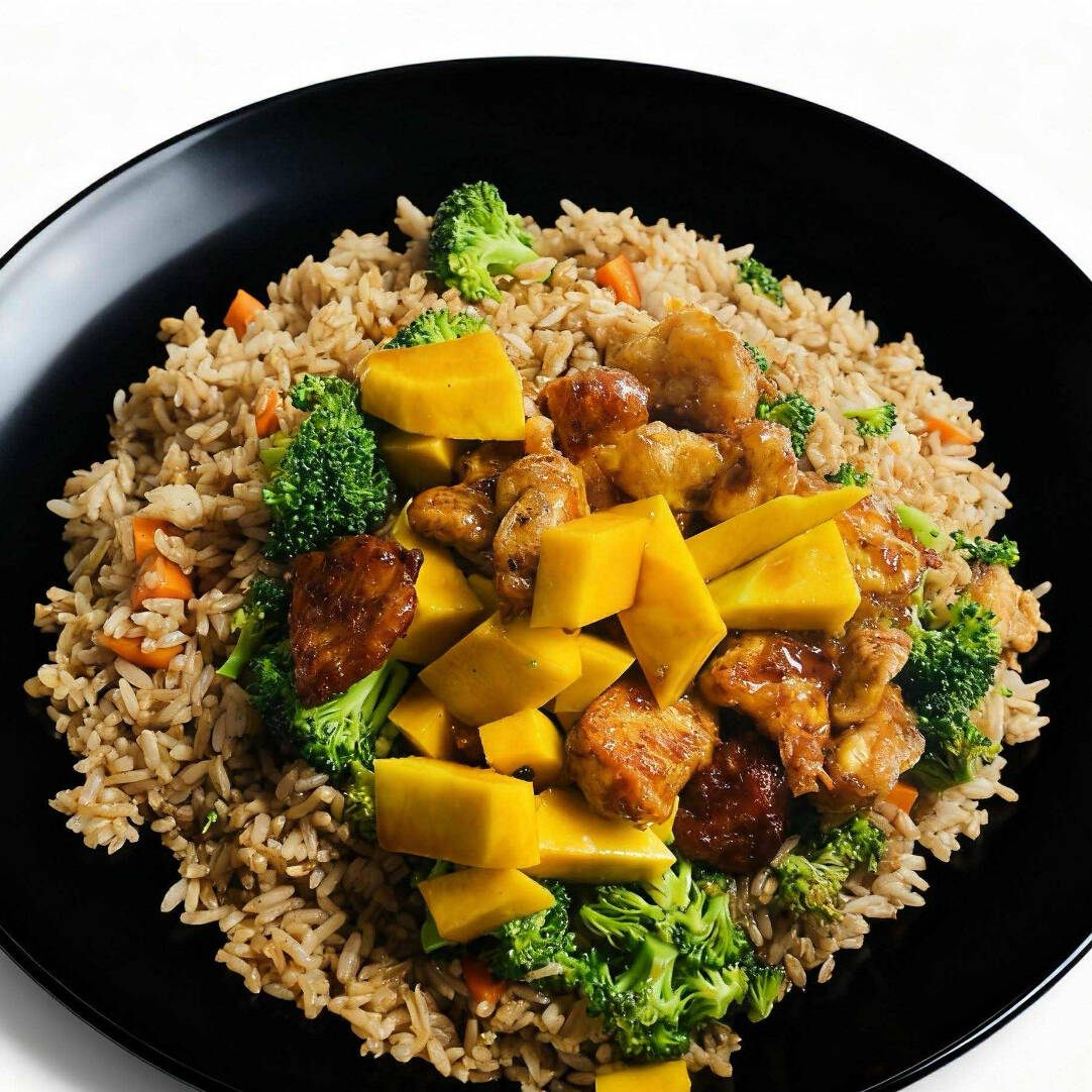 arroz frito con brócoli, pollo, piña bañado en salsa teriyaki