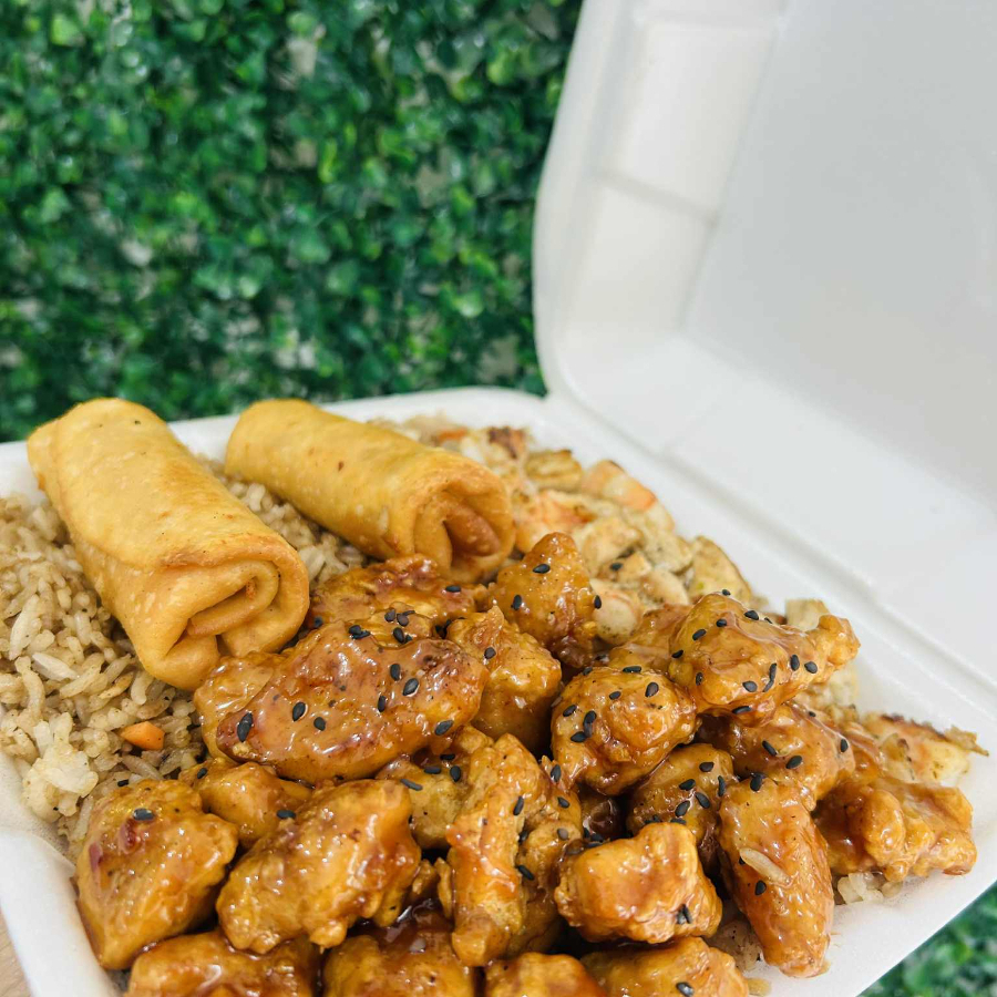 Arroz frito con pollo a la naranja y 2pz de rollo primavera