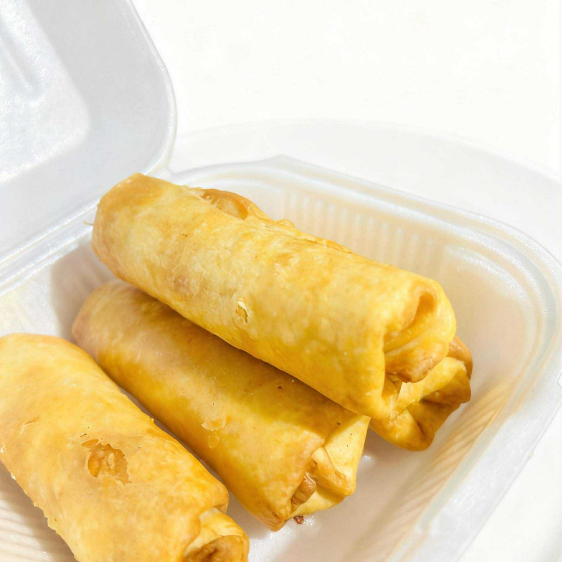 rollo Philadelphia, envuelto en egg roll, coronado con parmesano, tocino y cebolla