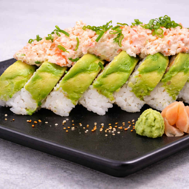 rollo de aguacate por fuera, coronado con ensalada Tampico, camaron empanizado y salsa de anguila