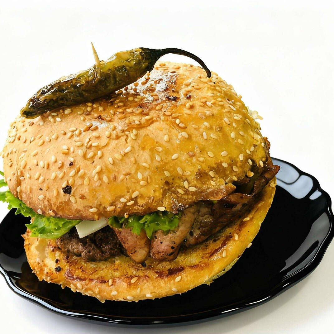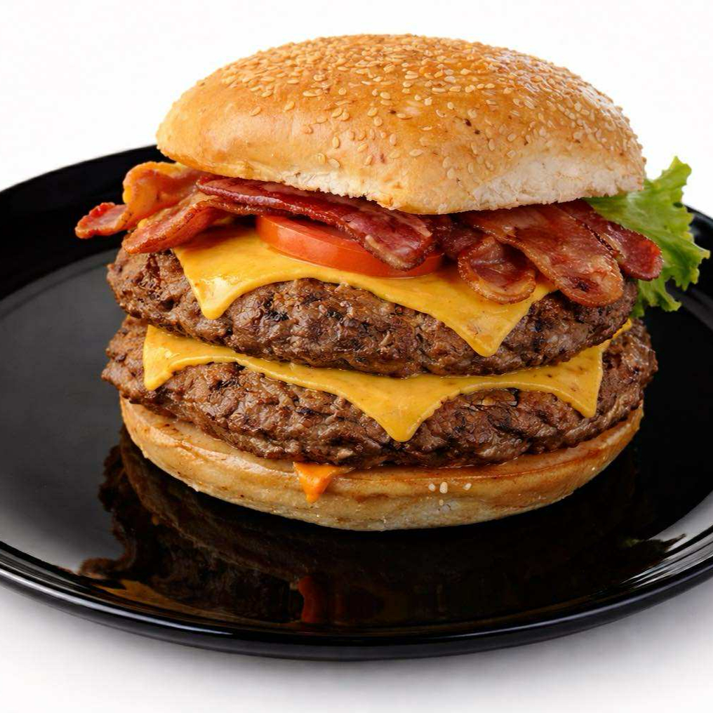 Hamburguesa de carne de res, camarones a la plancha, tocino, aguacate y doble queso
