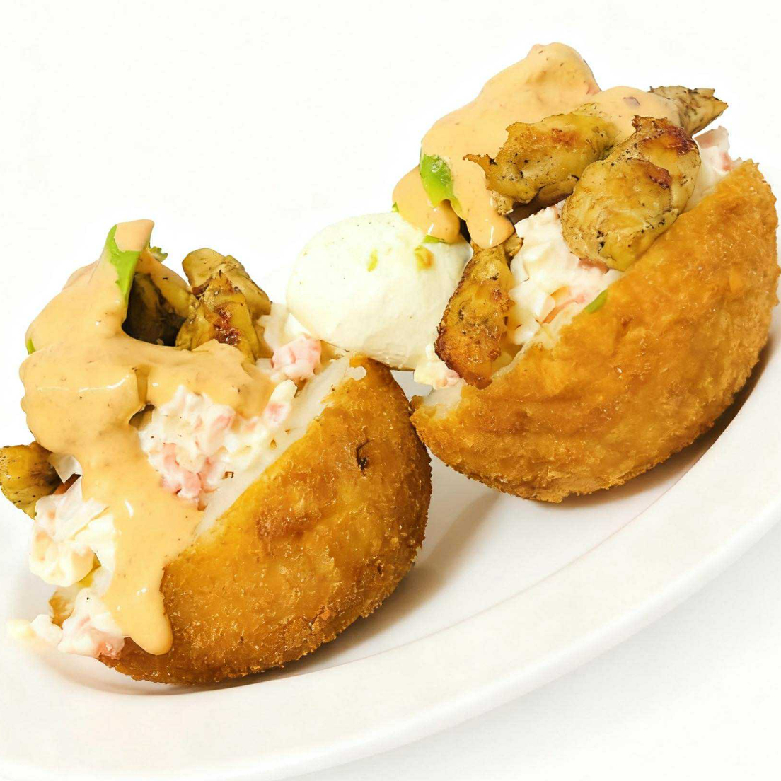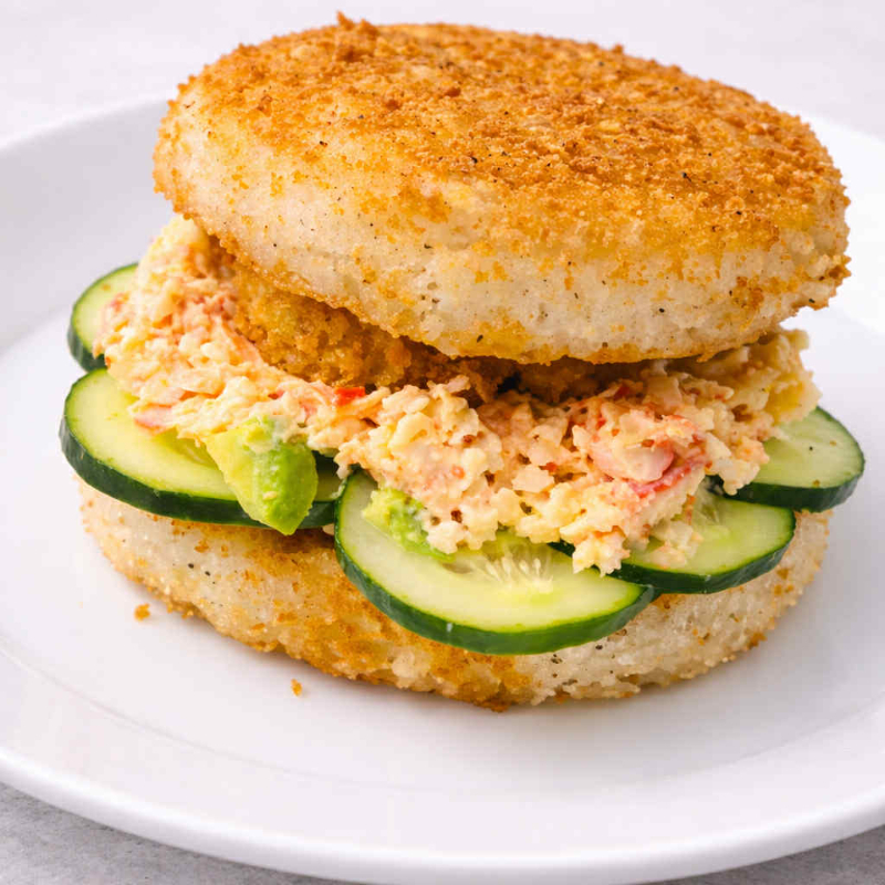 burger de arroz empanizado rellena de Tampico, pepino, zanahoria rallada, pollo empanizado, aguacate y chipotle