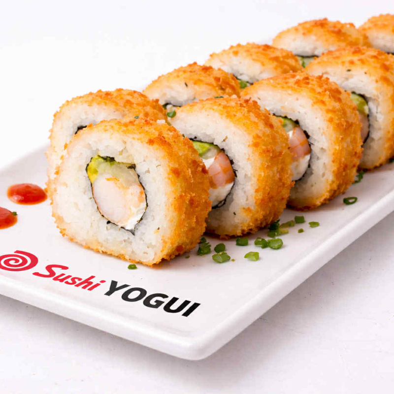 rollo empanizado Por fuera, por dentro Philadelphia, pepino, aguacate, proteína a elegir (camarón, surimi, pollo, Res)