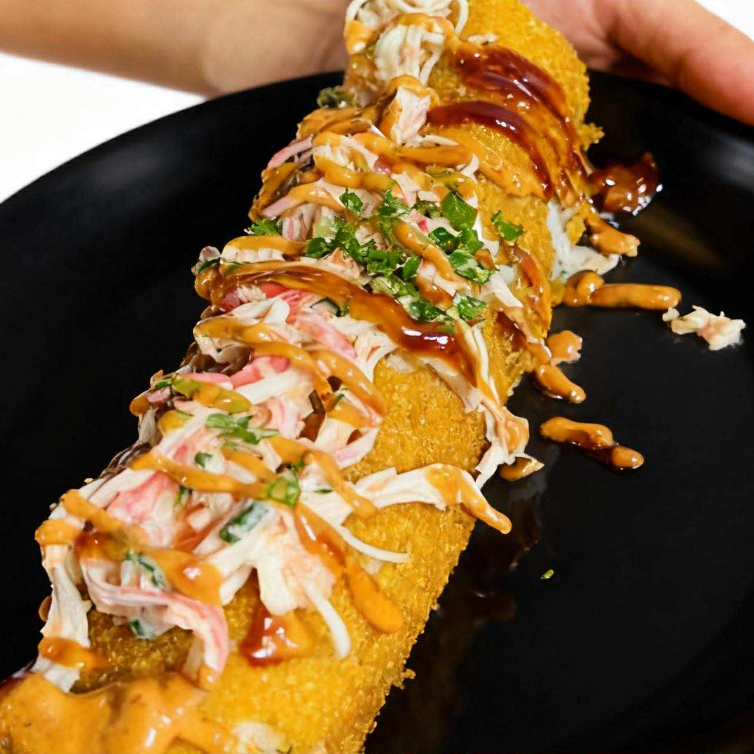 sushi dog empanizado, relleno de ensalada Tampico, Philadelphia, aguacate, pollo empanizado, chipotle y salsa de anguila