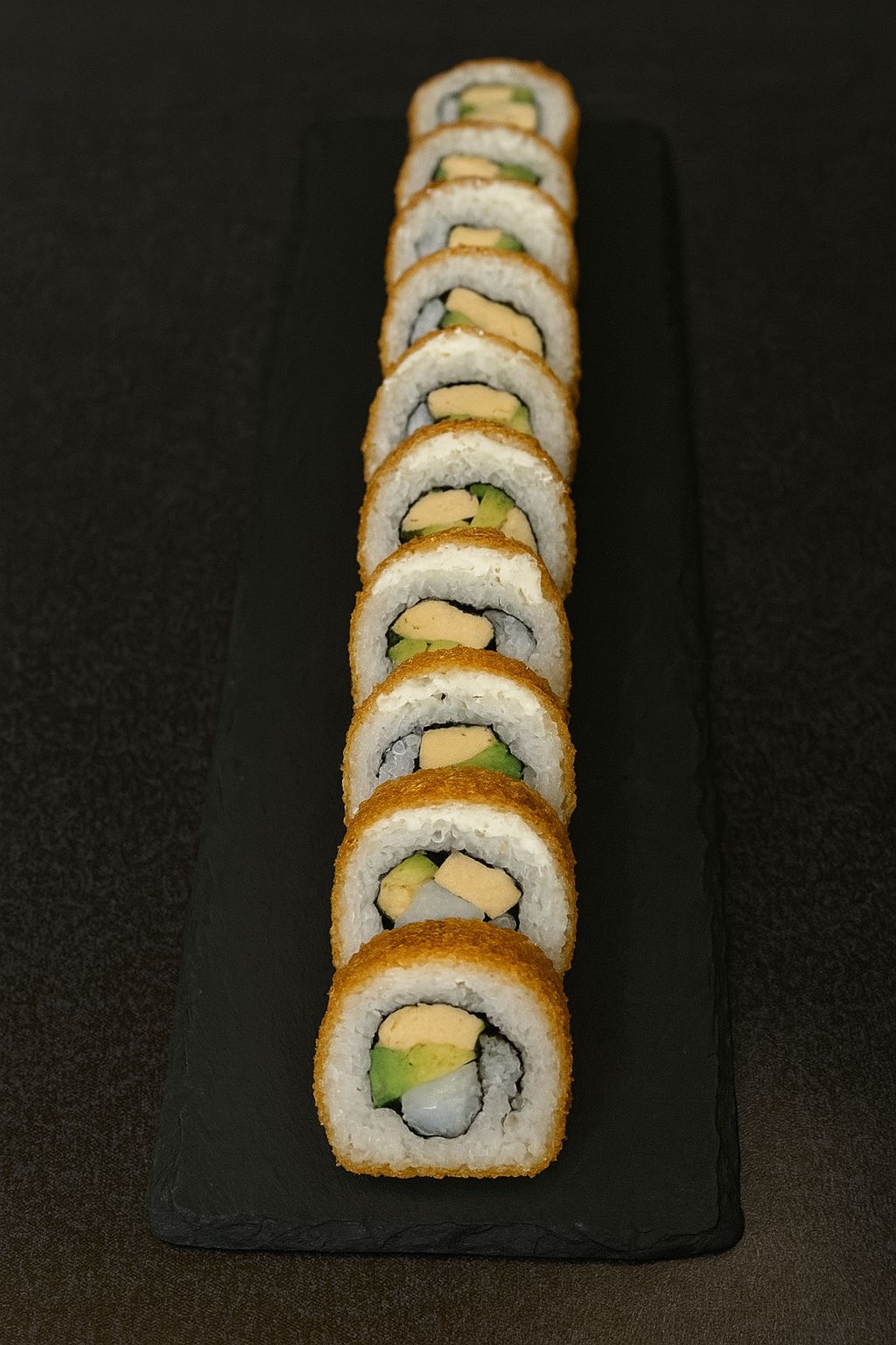 Delicioso sushi al tempura clásico japonés, relleno de aguacate, pepino y zanahoria.