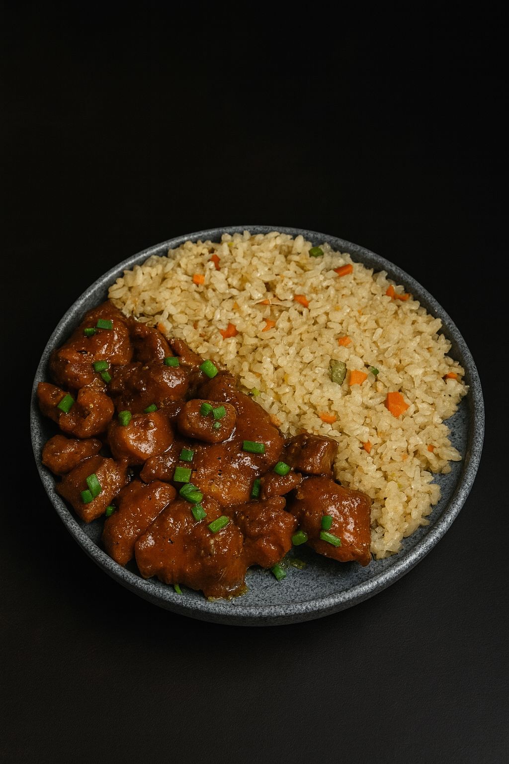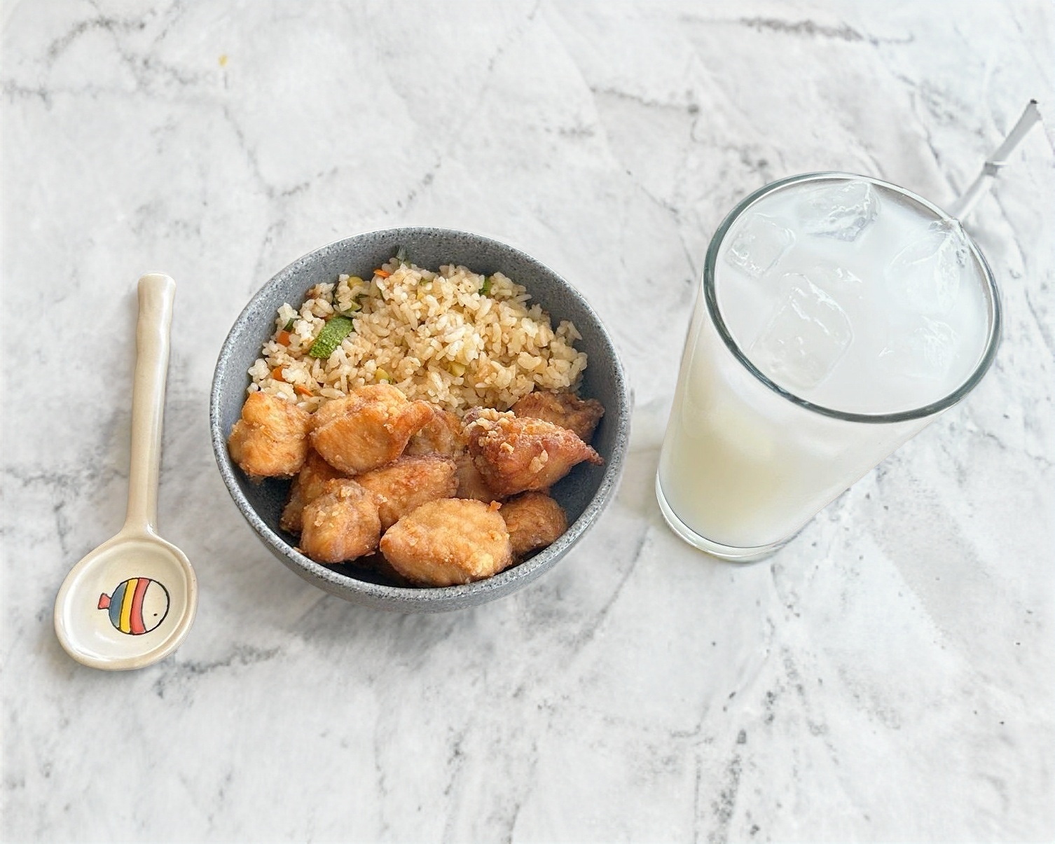 Deliciosos trozos de pollo frito acompañados con una guarnición de arroz frito.