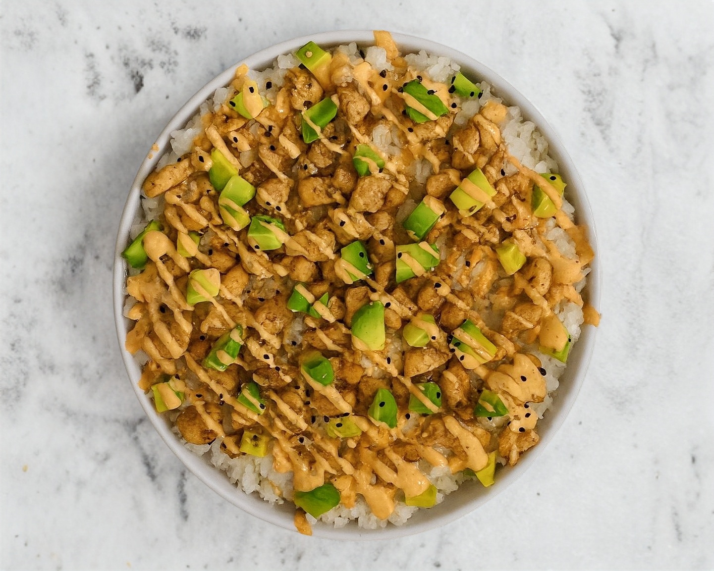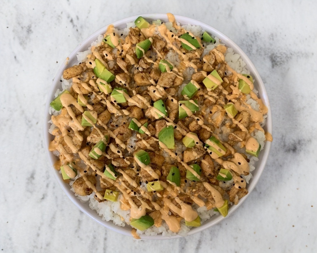 Arroz blanco directo de la arrocera acompañado de pollo o camarón frito coronado con aguacate, aderezo de chipotle