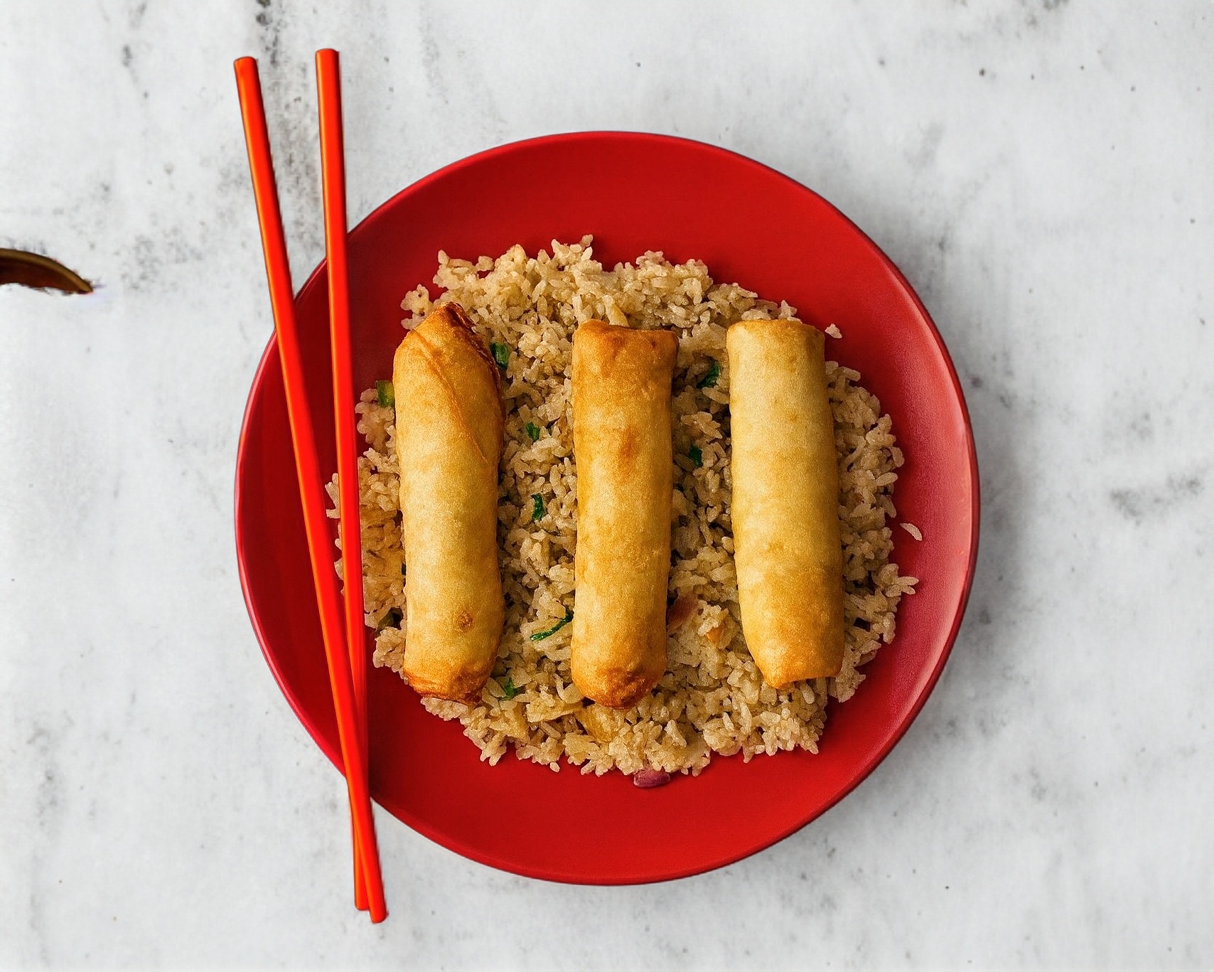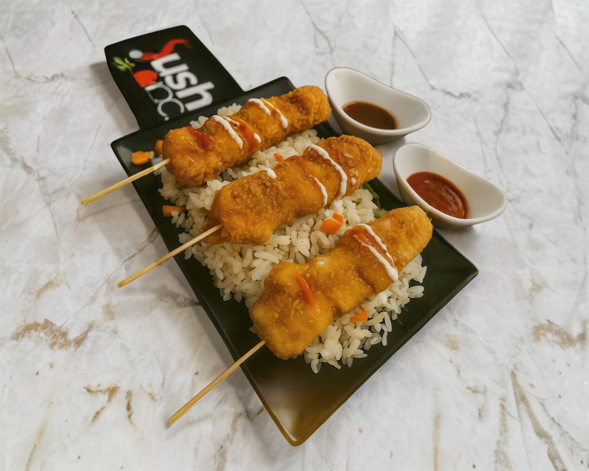 5 camarones empanizados, rellenos de philadelphia acompañados con arroz frito y bañados en aderezo.