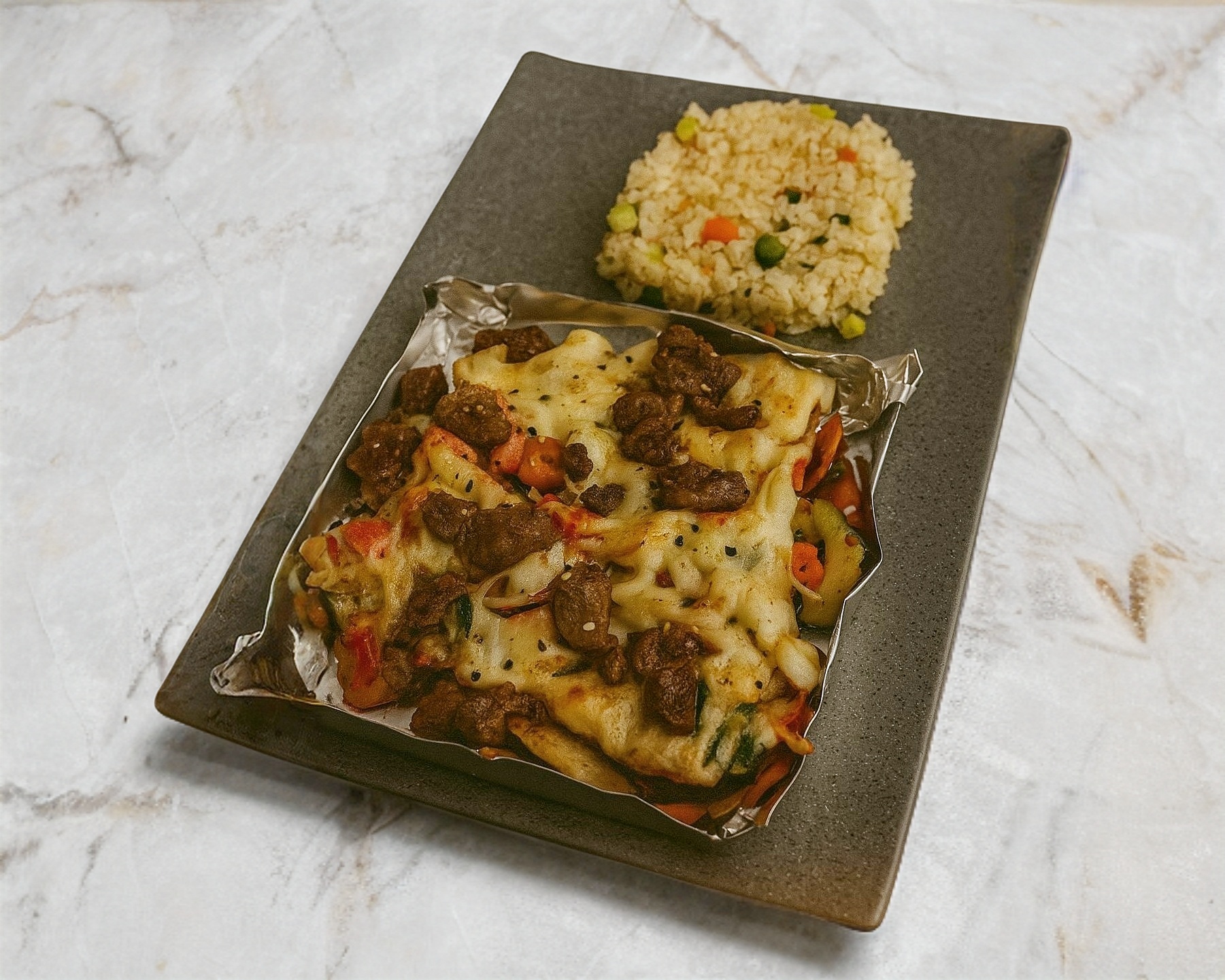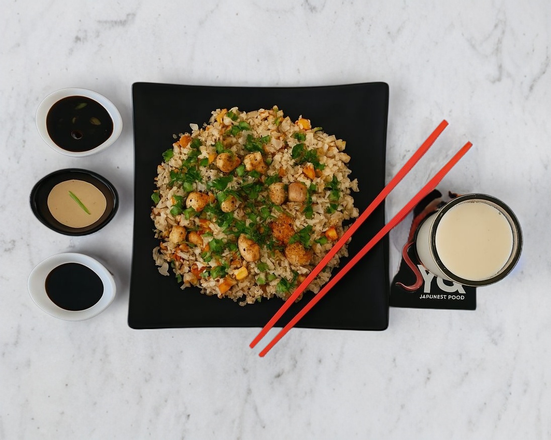 Delicioso arroz frito coronado con Philadelphia y Aguacate adornado con un toque de ajonjolí tostado. proteína a elección