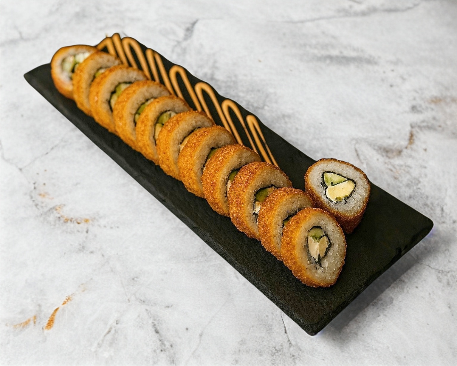 Sushi empanizado por fuera, proteína a elección camarón, surimi, pollo o res.