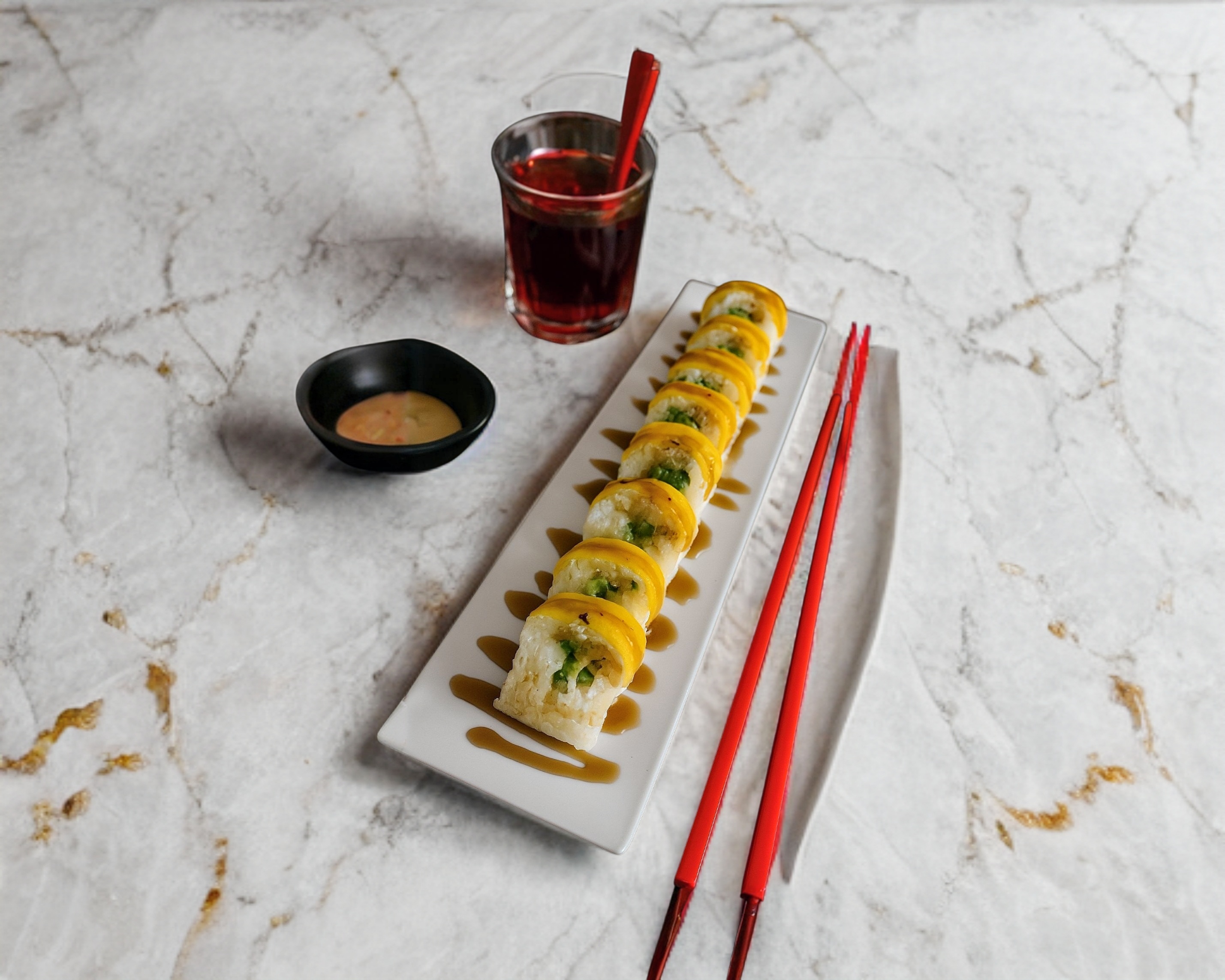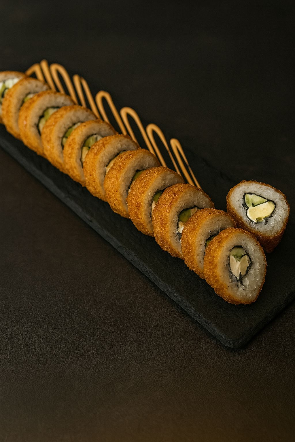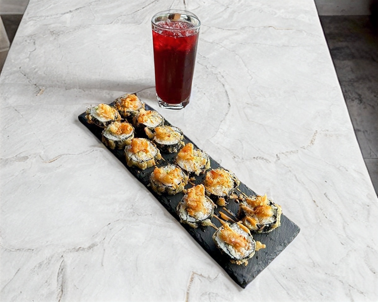 Sushi con queso manchego derretido por fuera bañado con aderezo especial y un toque de ajonjolí tostado