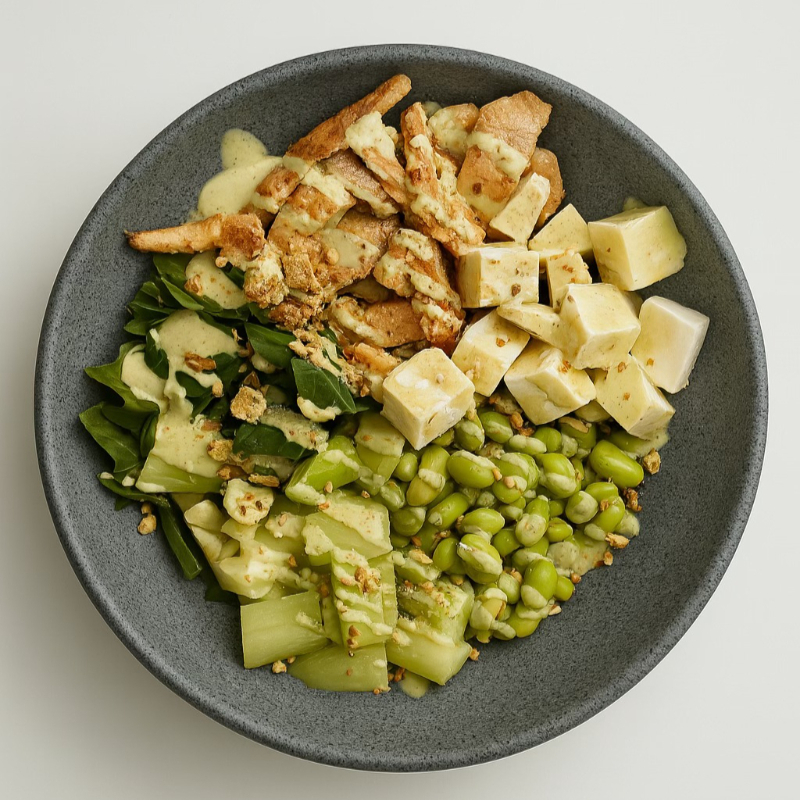 Arroz blanco directo de la arrocera bañado con aderezo chipotle coronado con aguacate, proteína a elección