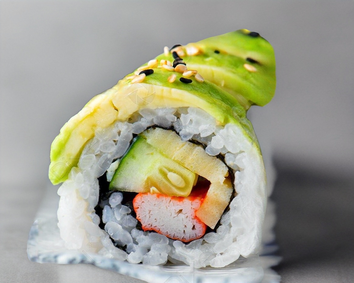 Por fuera aguacate, camarón. surimi, Philadelphia, plátano macho acompañado de ensalada surimi.