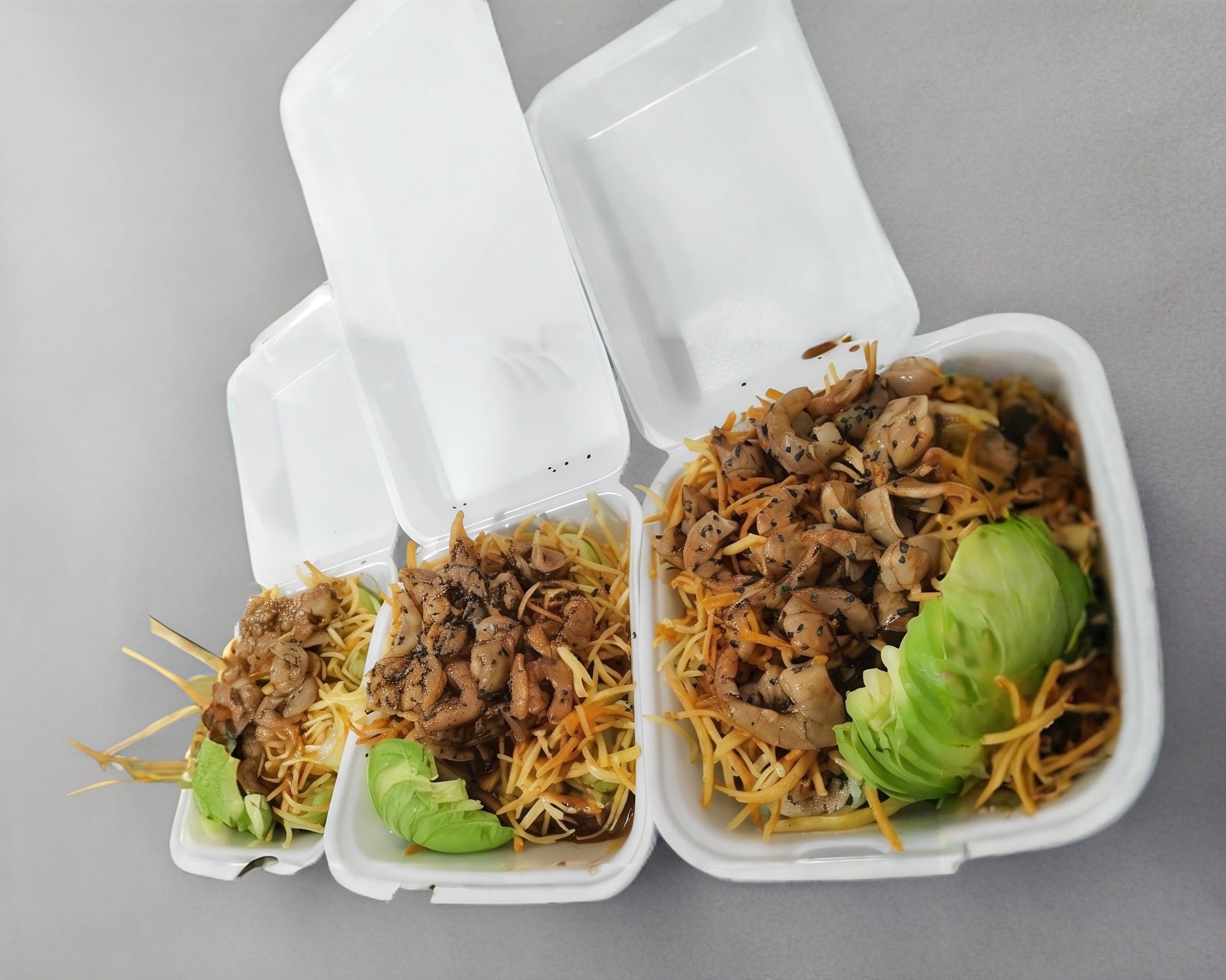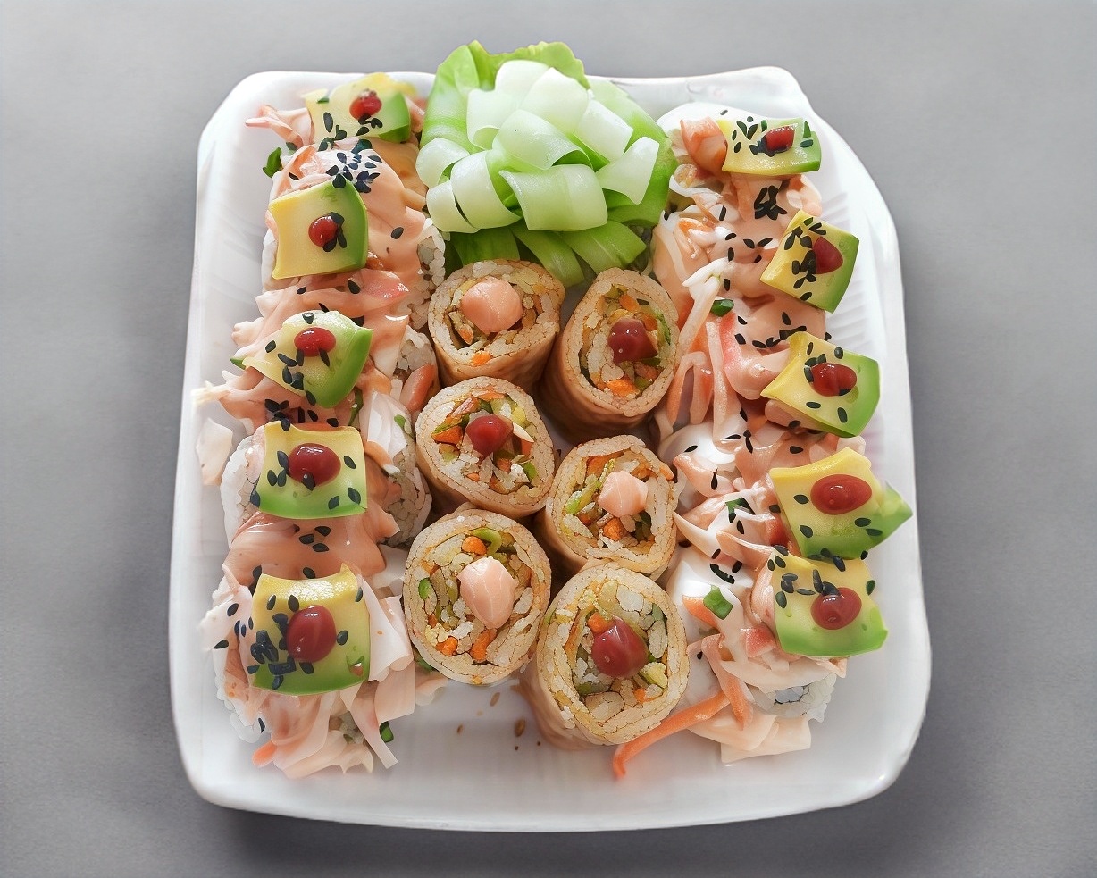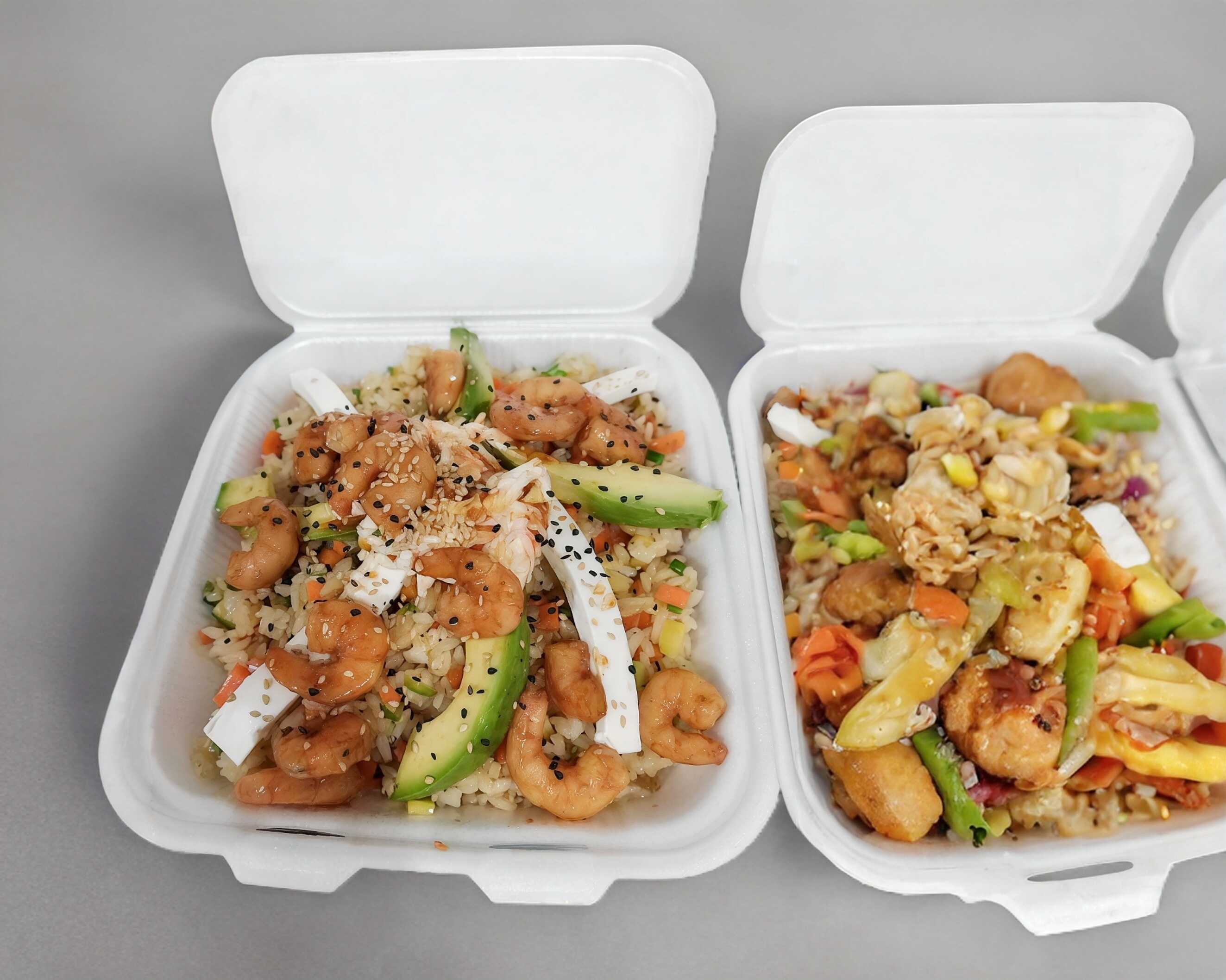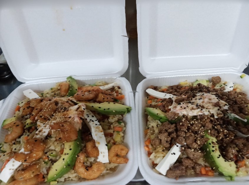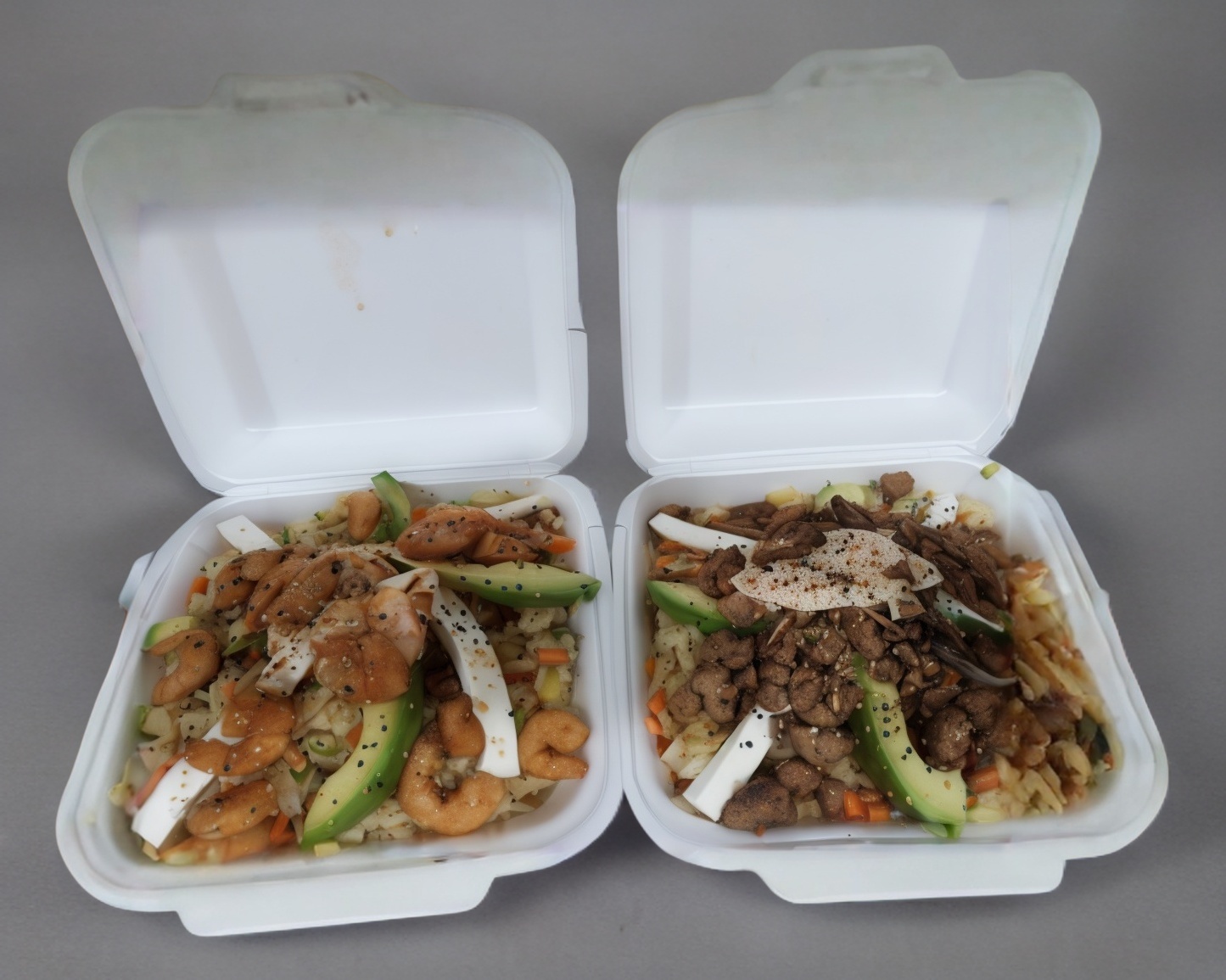 Arroz y verduras salteadas con camarón, ensalada surimi, aguacate, Philadelphia y un sushi Philadelphia.