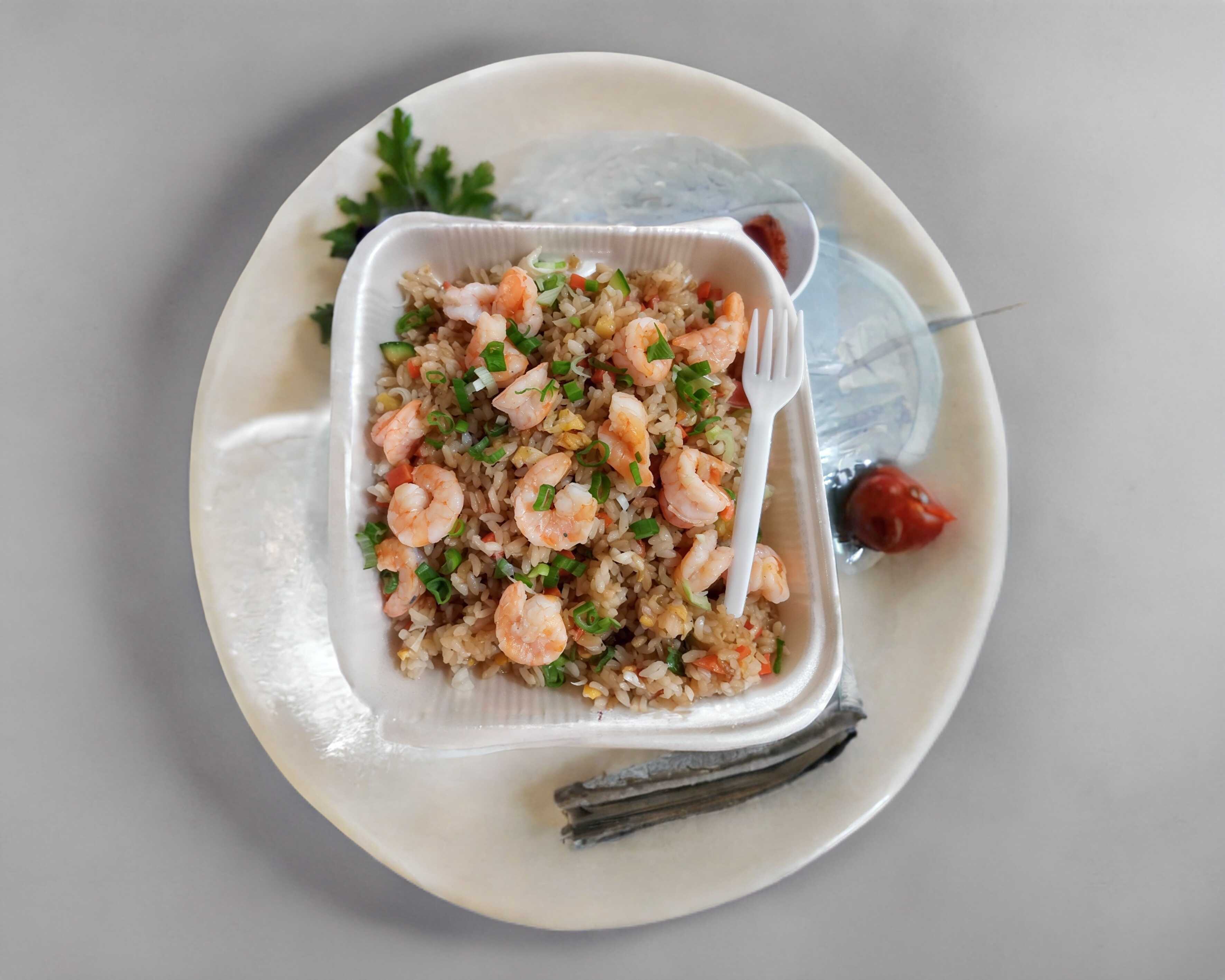 Arroz frito con verduras y camarón salteado, medio rollo de camarón.