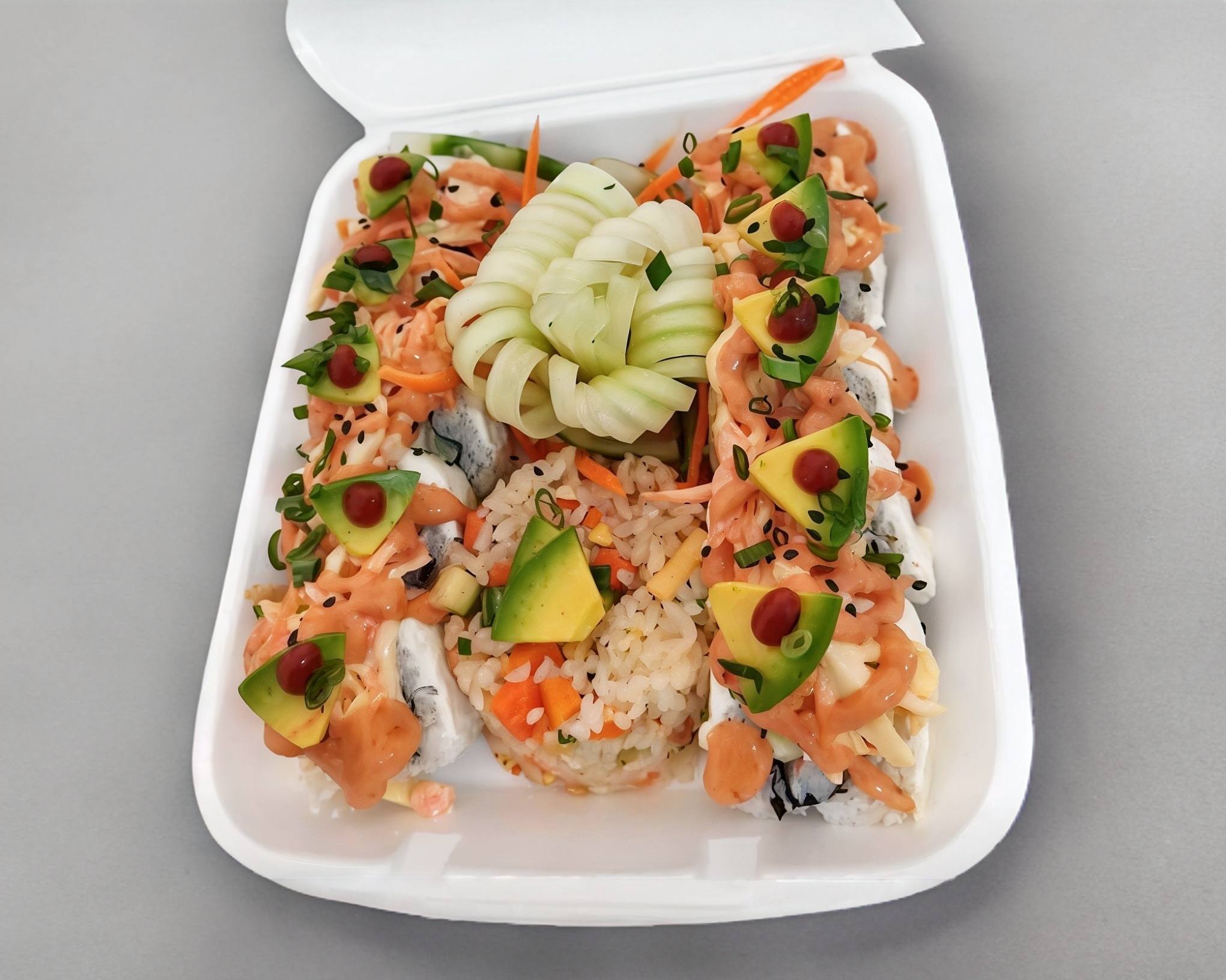 Rollo por fuera Philadelphia topping ensalada de surimi bañado en chipotle y coronado con un trocito de camarón empanizado y aguacate.