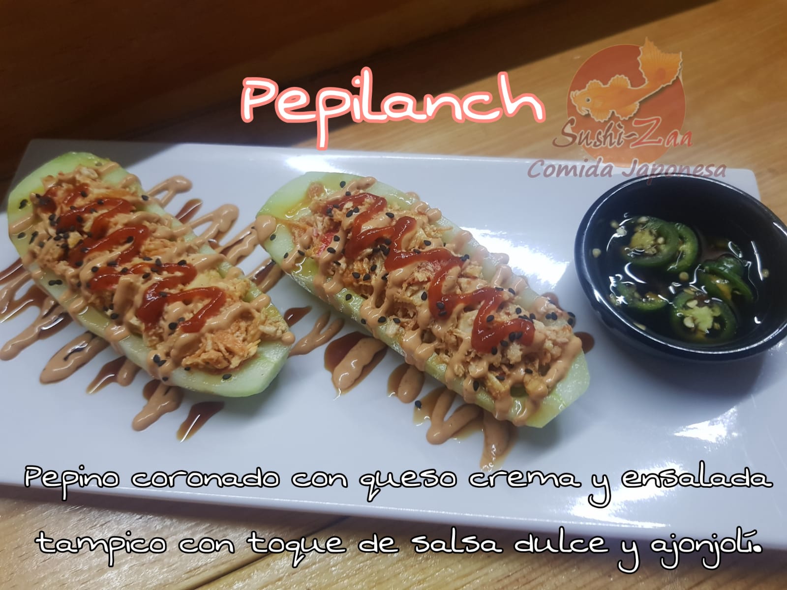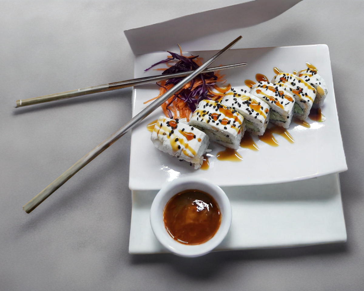 Pepino, aguacate y queso crema por dentro, empanizado por fuera con ensalada a base de queso crema, surimi, cebollin y tocino con toque de salsa de anguila y ajonjoli