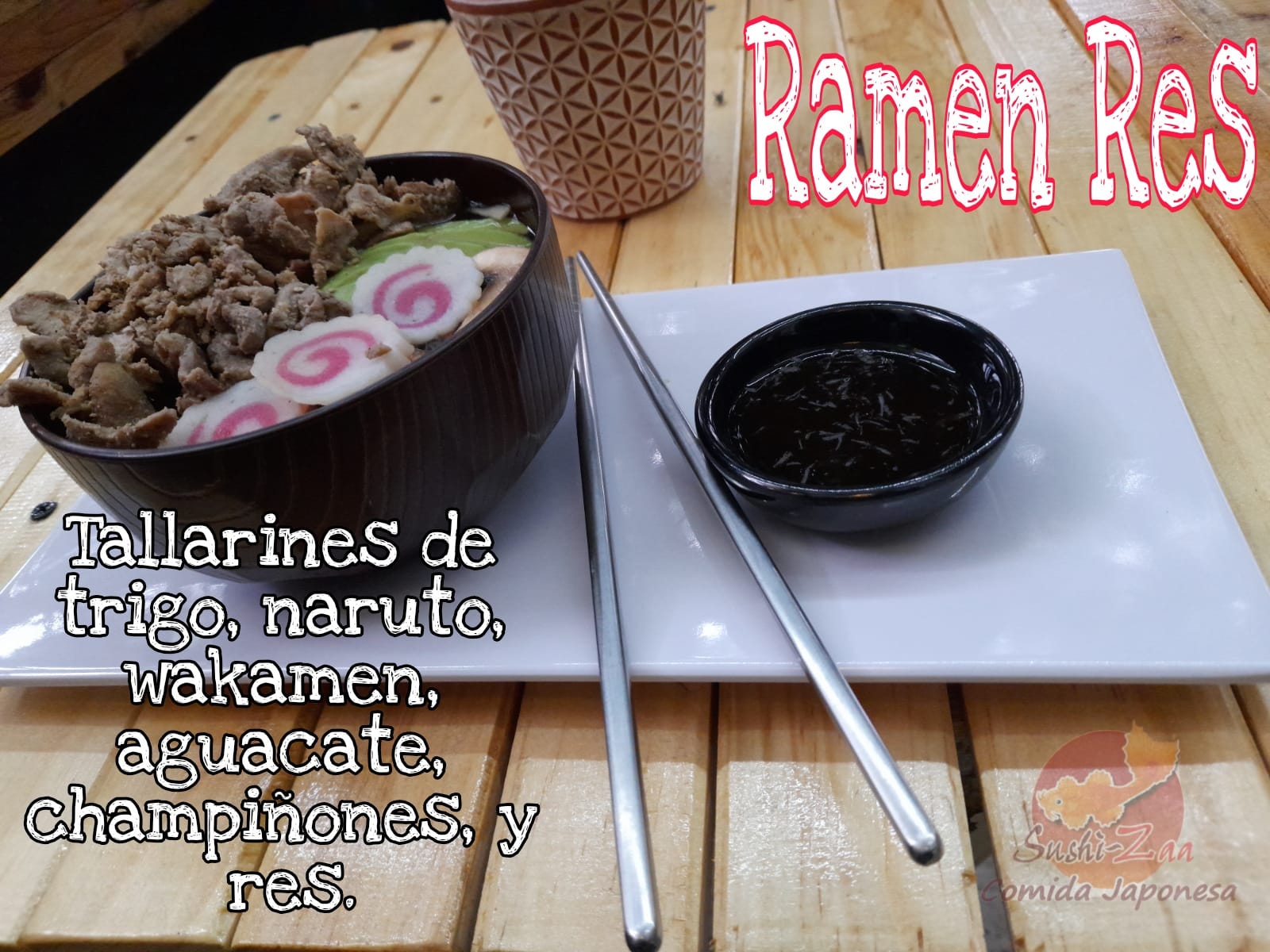 Tallarines de Trigo y Res en caldo ramen especial, aguacate y huevo.