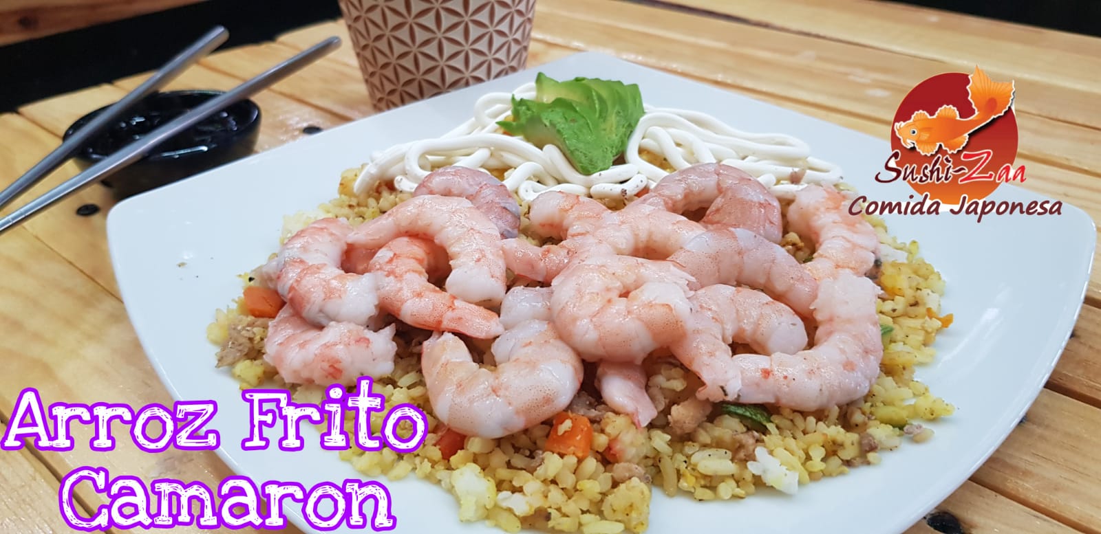 Arroz blanco o frito con camaron acompañado de aguacate y queso crema