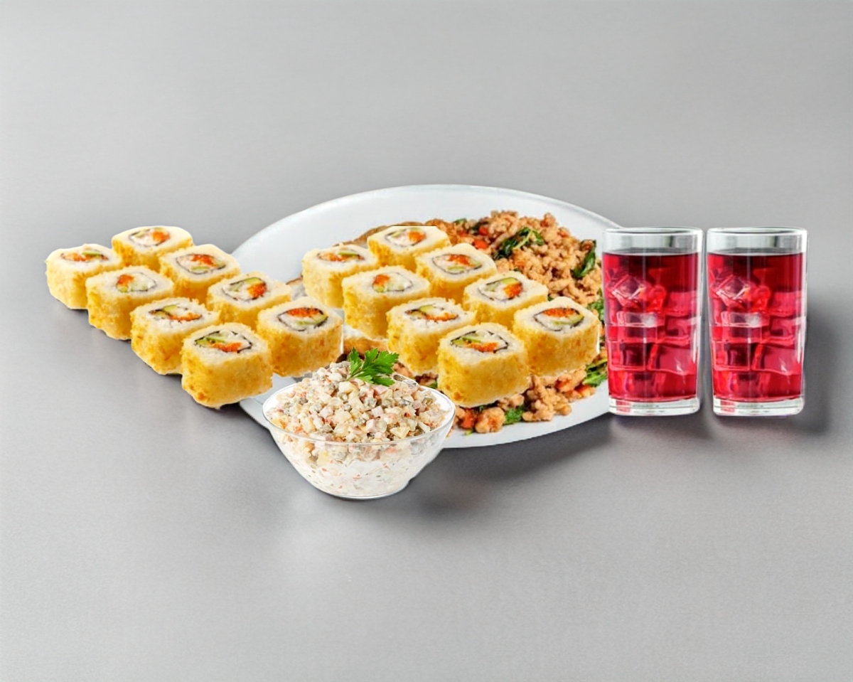 2 Sushis, 1 Arroz frito, 1 Ensalada Tampico y 2 Aguas Frescas