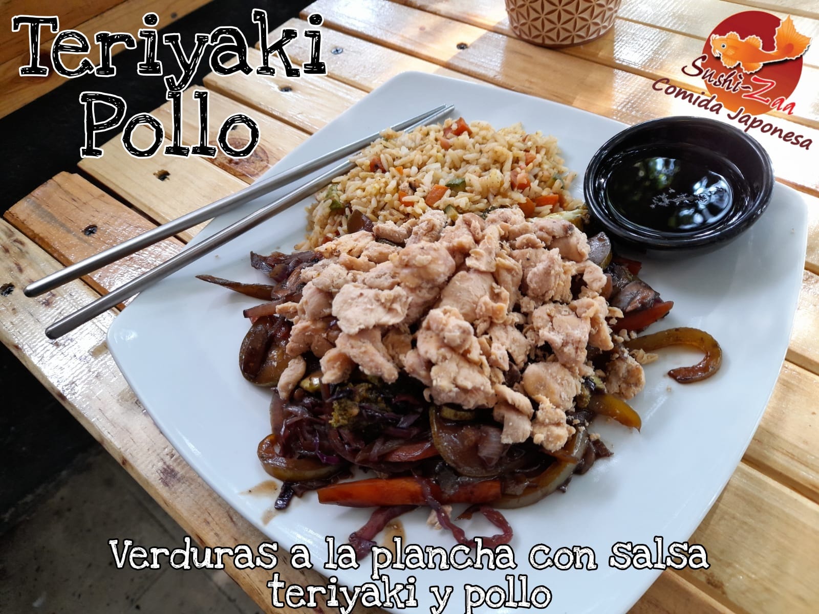 Verduras a la plancha condimentadas con salsa teriyaki, proteina a elegir.