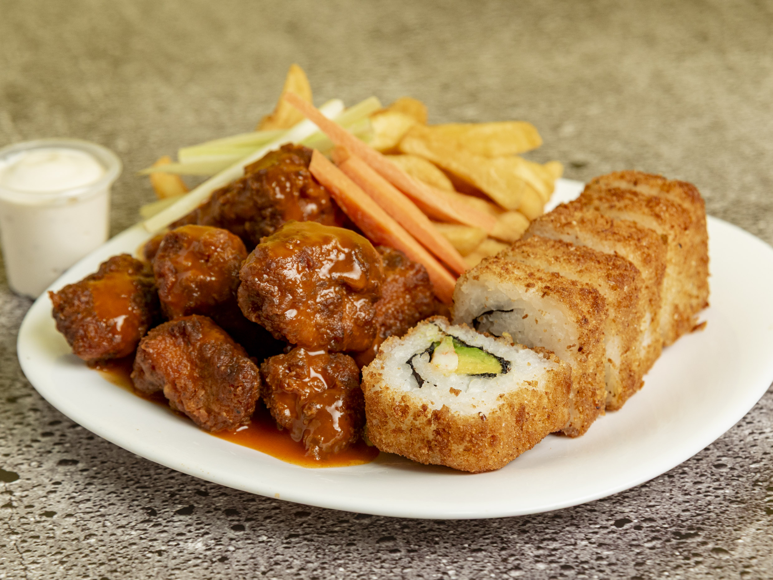 1/2 sushi, papas y boneless.