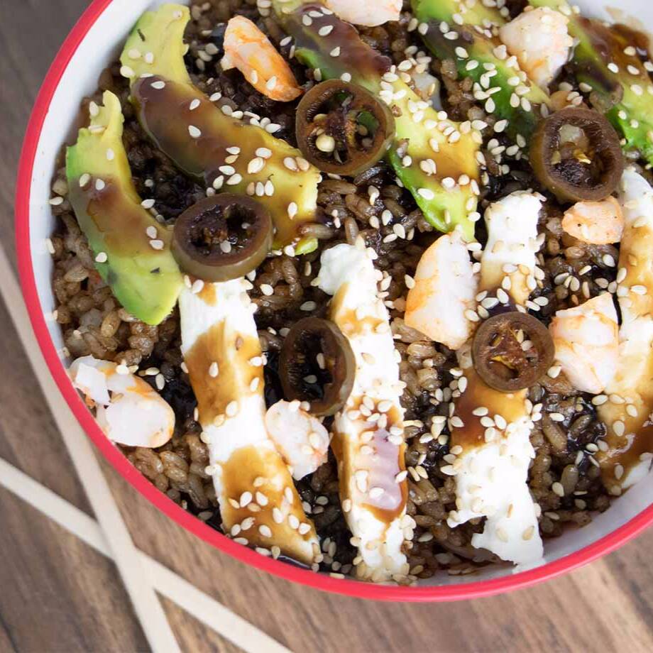 Arroz frito, Brocoli, zanahoria, camaron aguacate, philadelphia, salsa de la casa con ajonjoli y cebollin