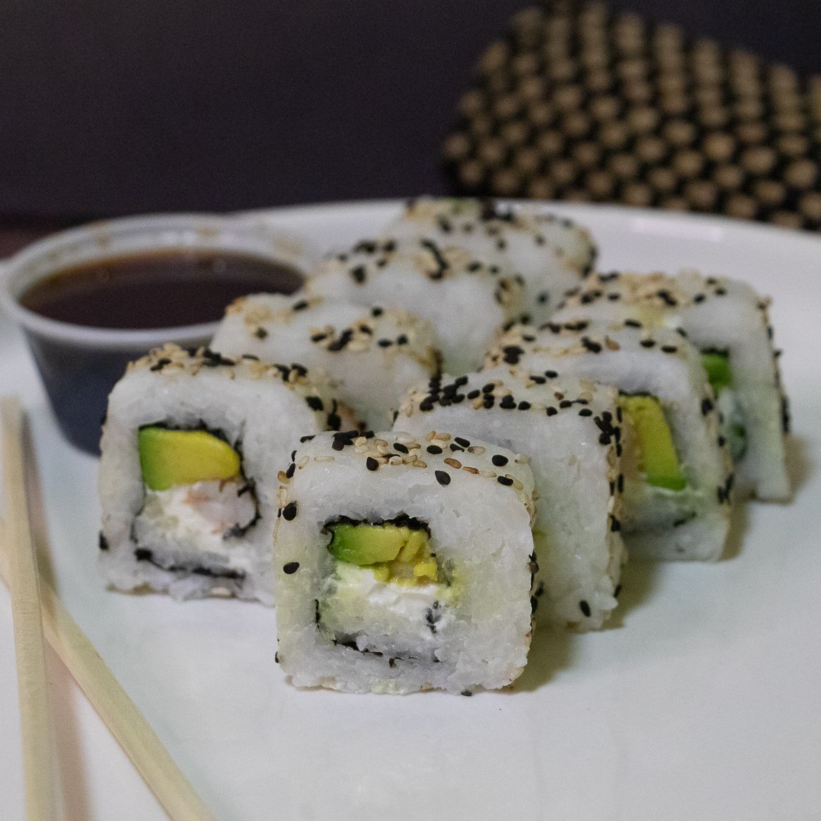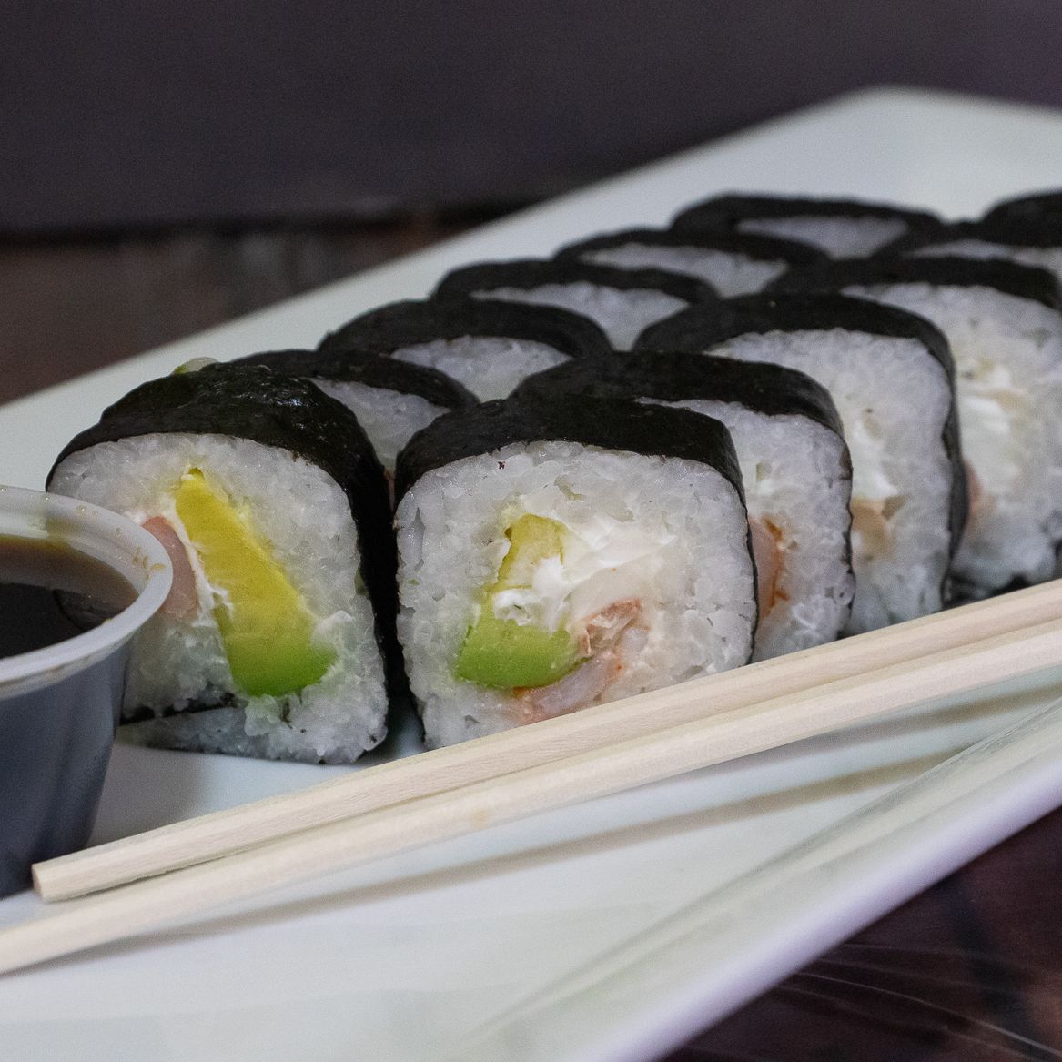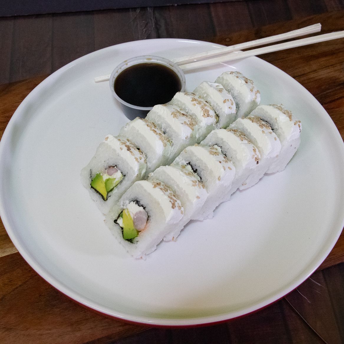 (Camarón y aguacate alga nori por fuera)